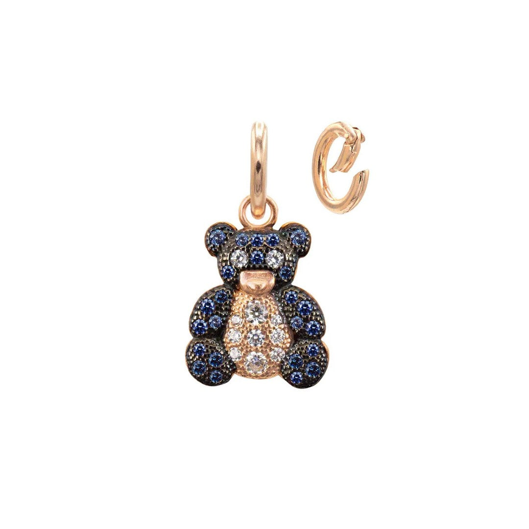 Ciondolo pendente in argento rosato da donna di Alisei Gioielli. Pendente in argento rosato a forma di orsetto con uno studio particolare di incassatura mista con cristalli di colore bianco e blu. Fatto in Italia.