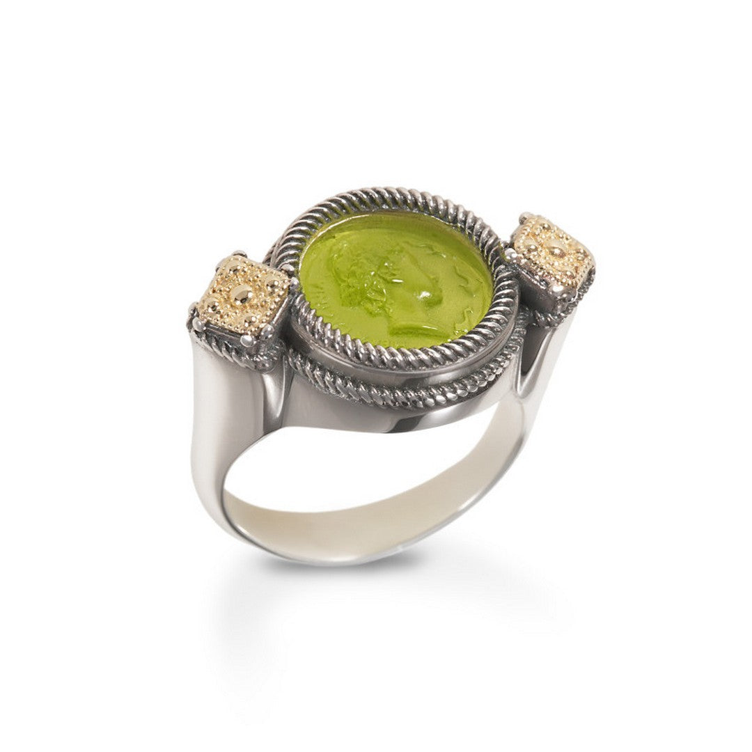 Anello Gerardo Sacco in oro 9 kt e argento 925 dal gusto neoclassico, con paste vitree e perle. Linee armoniose e proporzioni eleganti per un gioiello che esprime raffinatezza. Riferimento 35129.