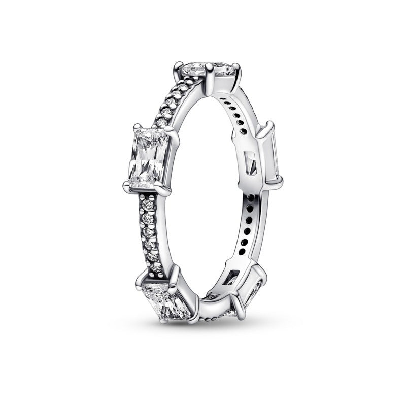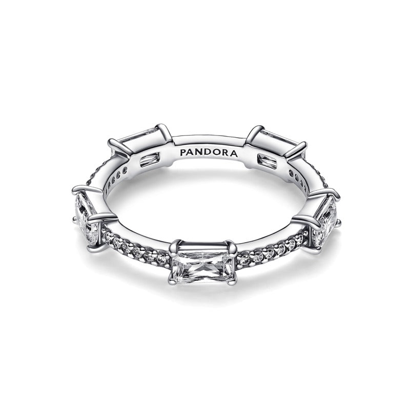 Pandora Pavè con Pietre Luminose, argento sterling 925; 5 zirconia cubica incolore rettangolare taglio radiante, incastonatura a griffe; 30 zirconia cubica incolore taglio brillante rotondo, incastonatura a granette