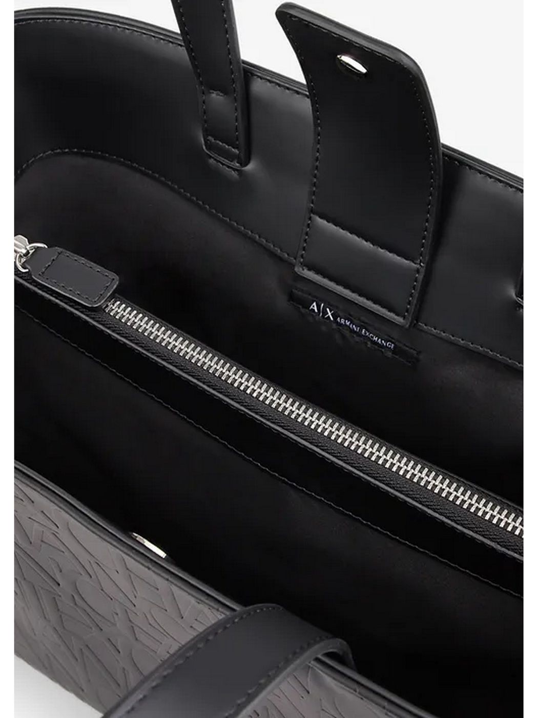 Borsa AX in ecopelle tinta unita con logo in rilievoa ll'over. Doppio manico e tracolla removibile. Chiusura con bottone automatico. All'interno tre scomparti di cui uno centrale con zip.