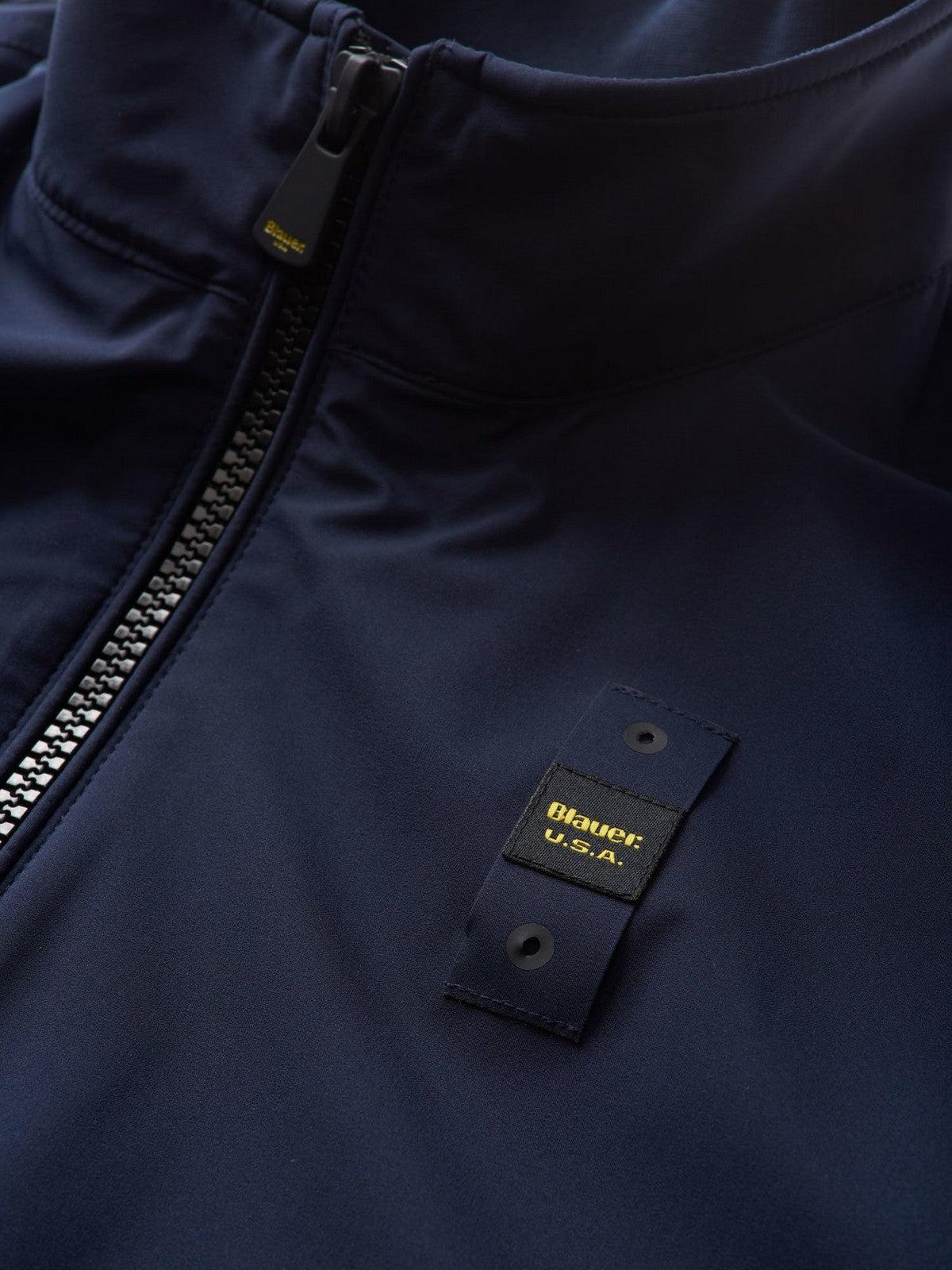 Giubbino BLAUER in neoprene tinta unita. Colletto alla coreana e maniche lunghe. Fondo e polsi a costine. Chiusura centrale con zip. Due tasche zippate. Passante blauer sul petto e stemma sulla manica applicata. Sfoderata.