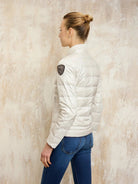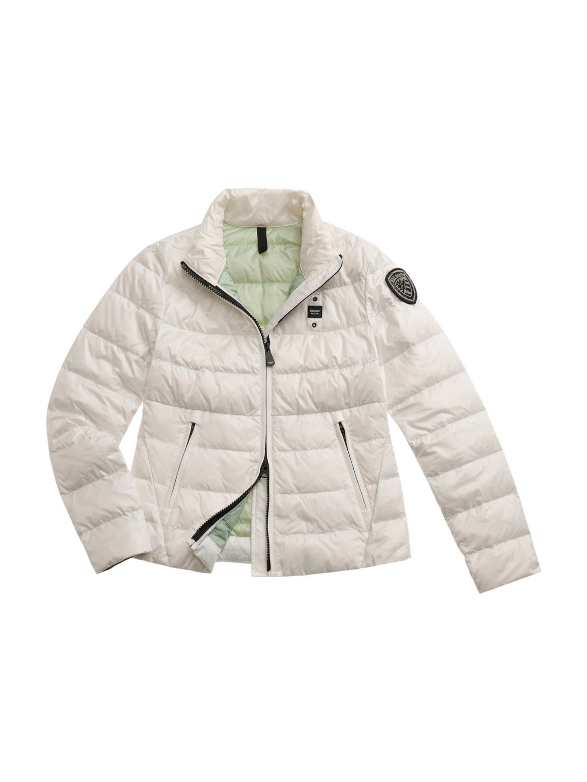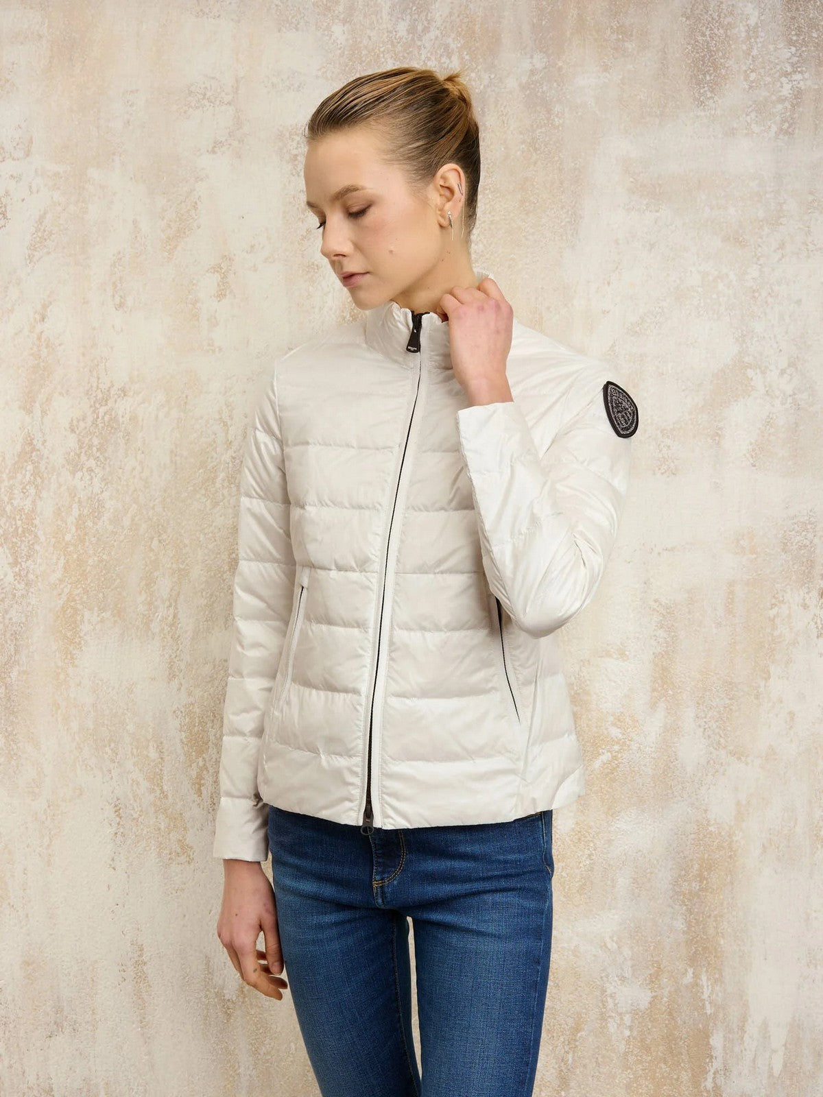 Piumino BLAUER con collo alla coreana e cuciture a righe orizzontali. Imbottitura leggera in morbida piuma e taglio svasato per risaltare la figura.