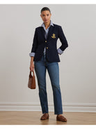Scopri la giacca slim fit perfetta per un look elegante e moderno, progettata per arrivare all'anca. La taglia M presenta una lunghezza del corpo di 65 cm e una lunghezza della manica di 82,5 cm, con leggere variazioni di 2 cm tra le taglie. Dotata di revers a punta e una silhouette a due bottoni, questa giacca presenta maniche lunghe con polsini a quattro bottoni, taschino sul petto sinistro e due tasche frontali applicate sui fianchi. I bottoni con stemma in rilievo e il patch "LRL" in bullion ricamato sul petto sinistro aggiungono un tocco distintivo al tuo stile. Fodera completa per una vestibilità confortevole.