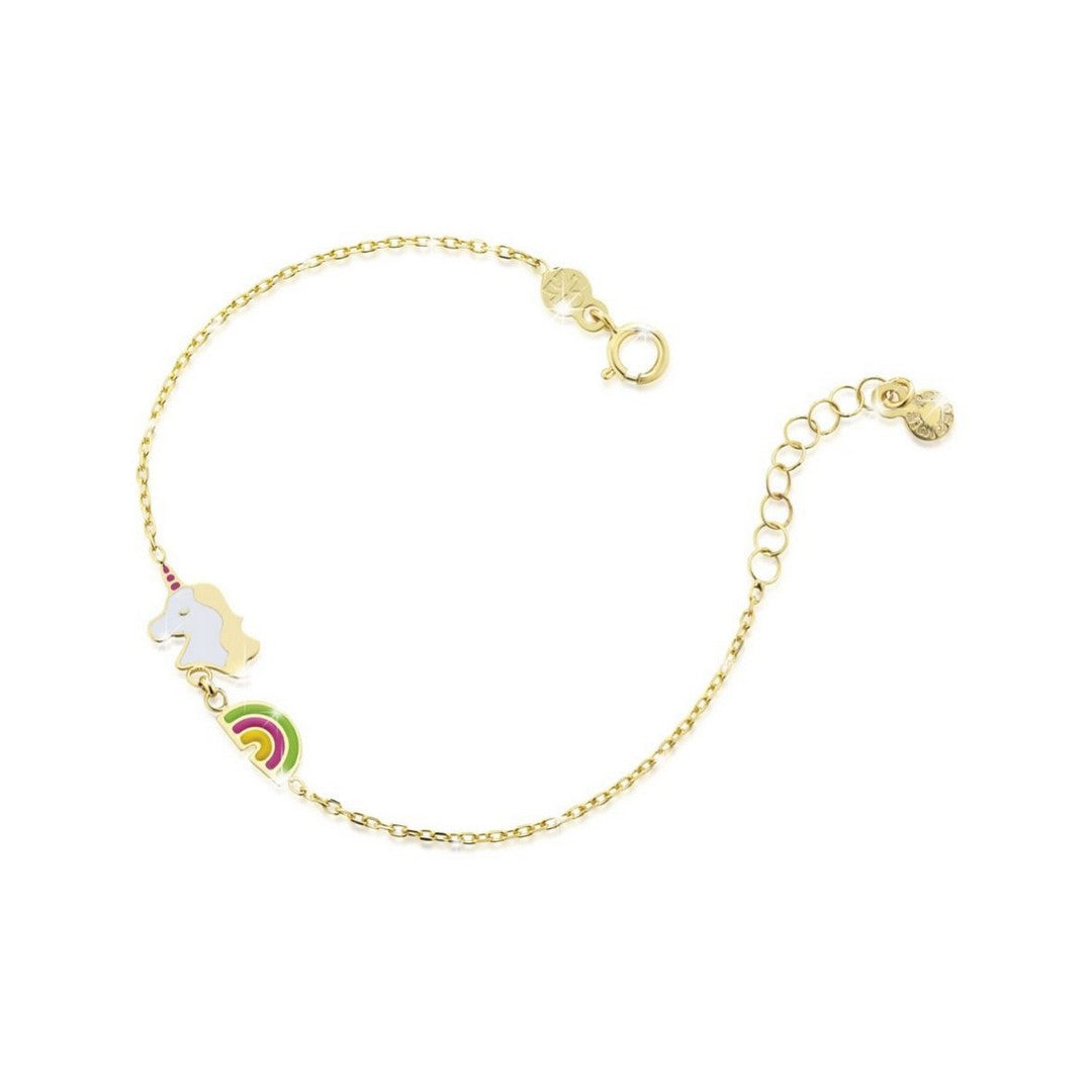 Bracciale in oro giallo con elementi a forma di unicorno e arcobaleno con smalto colorato