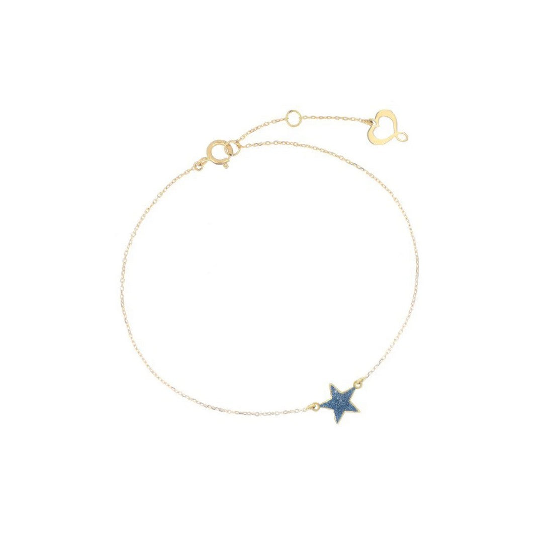 Bracciale catena della collezione Maman et Sophie Aurum Polvere blu da donna. Colore: oro e blu. Il gioiello è realizzato in oro giallo 750? (18kt) e presenta una stella centrale in polvere di diamanti blu di dimensioni 7 x 7 mm. All'estremità del bracciale è presente il cuore Maman traforato. Chiusura a moschettone.