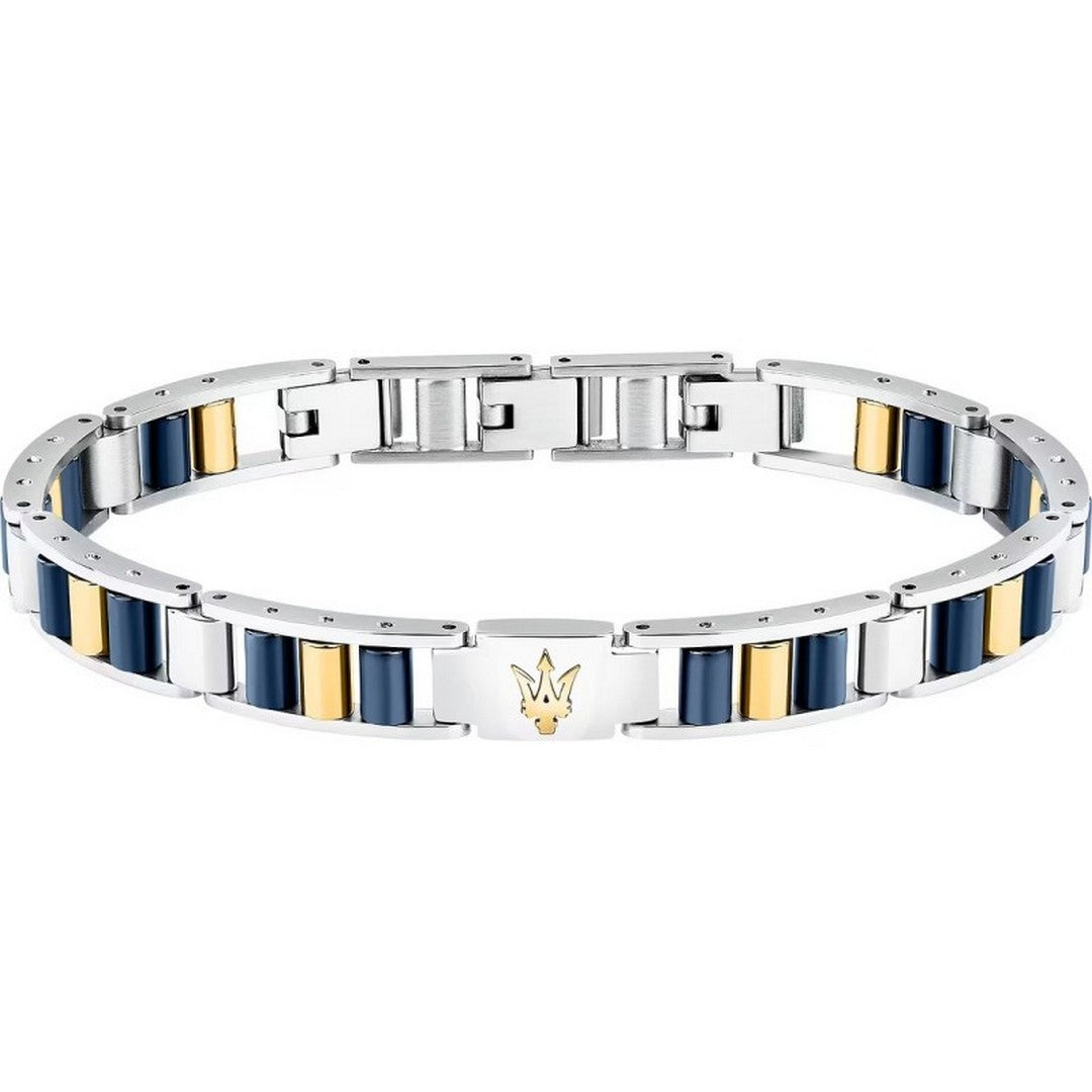 Gioiello da Uomo MASERATI della collezione CERAMIC realizzato in acciaio inox 316L con inserti in PVD gold e ceramica blu - Il bracciale è valorizzato al centro dal caratteristico logo a tridente del brand in PVD gold - Chiusura con gancio a scatto - Lunghezza regolabile da 18 a 21,5 cm - Garanzia Internazionale: 24 Mesi