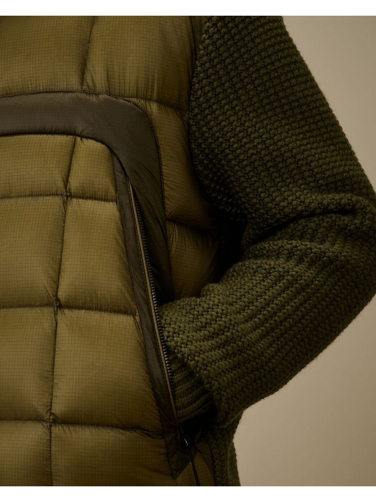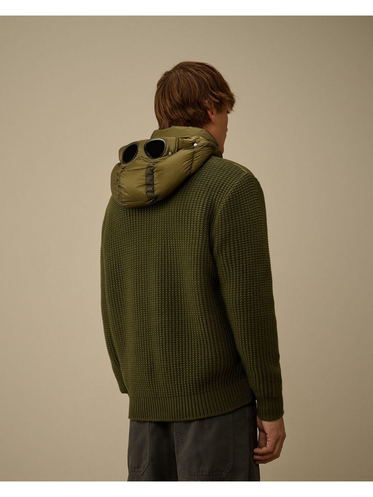 Cardigan C.P. COMPANY realizzato in lana merino extrafine con inserti mixed in D.D. Shell. Il modello è caratterizzato dall'iconico cappuccio con lenti Goggle di C.P. Company, staccabile e regolabile, e tasche laterali con zip nascosta. Rifinito con polsini a costine. Regular fit.