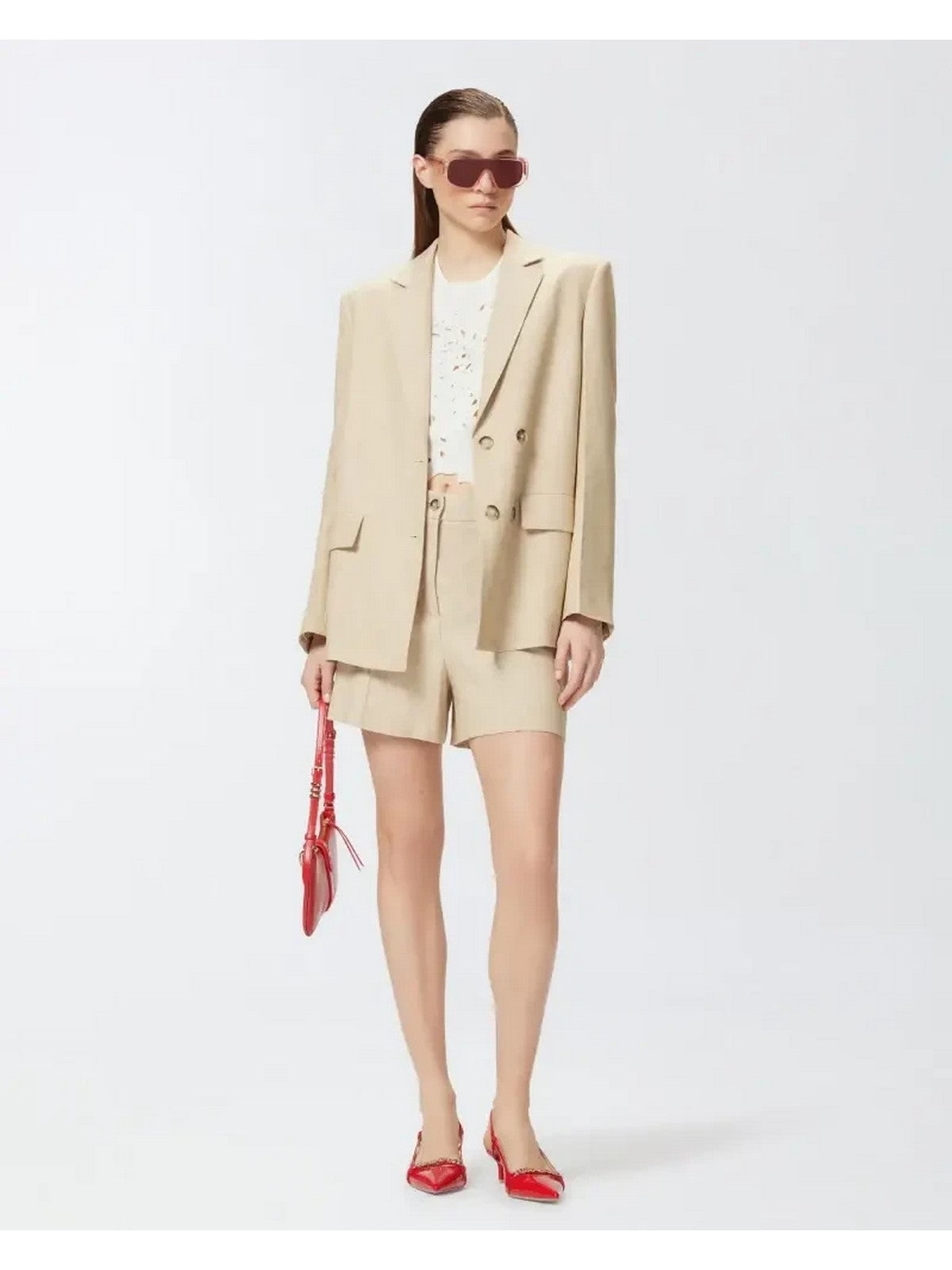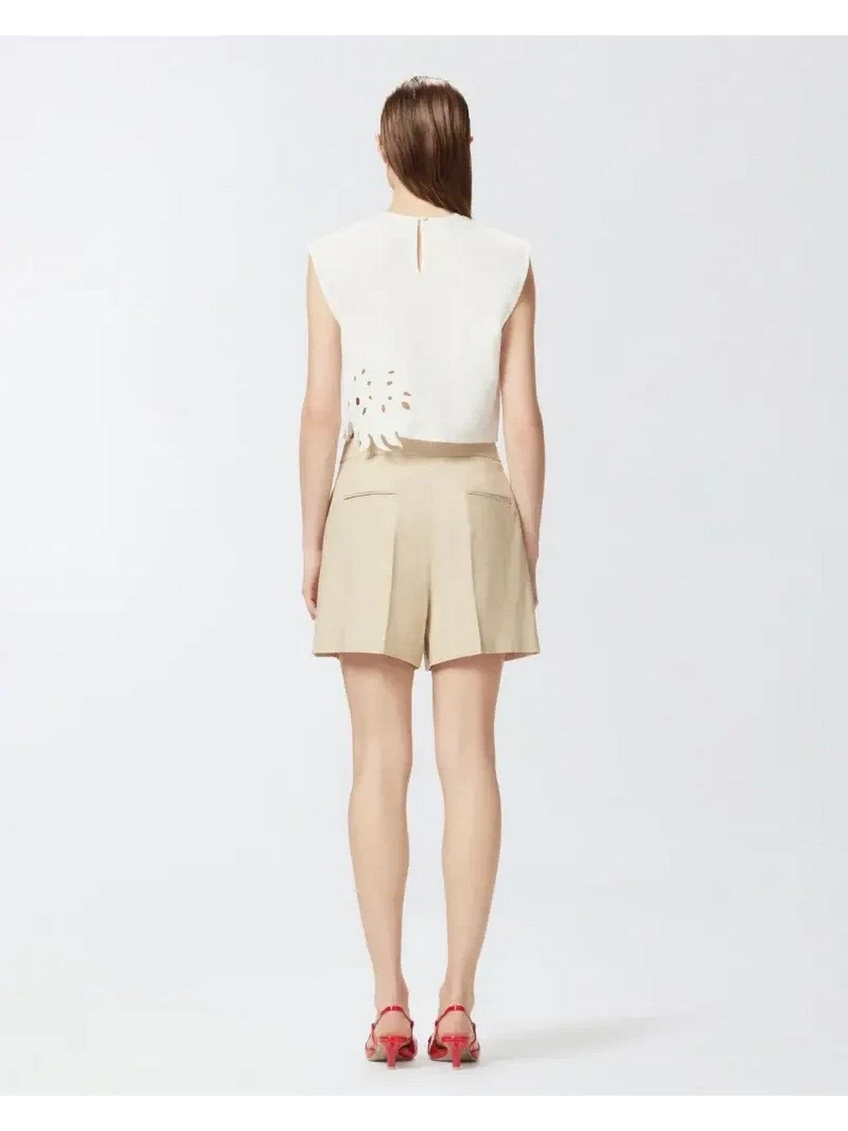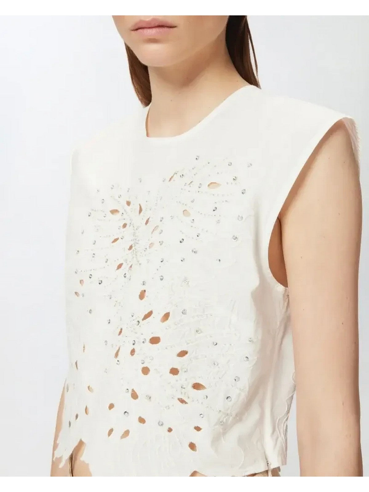 Top corto senza maniche da donna in popeline di cotone caratterizzato da ricamo sangallo che raffigura delle foglie tropicali, arricchito da cristalli applicati che illuminano il tuo look aggiungendo un tocco prezioso. Il top è completato da scollo tondo, fondo capo con orlo che segue il disegno del ricamo e piccola chiusura a goccia con bottone nel centro dietro. Questo top con ricamo prezioso è il perfetto capo da indossare con un tailleur colorato per una cerimonia o un matrimonio.
