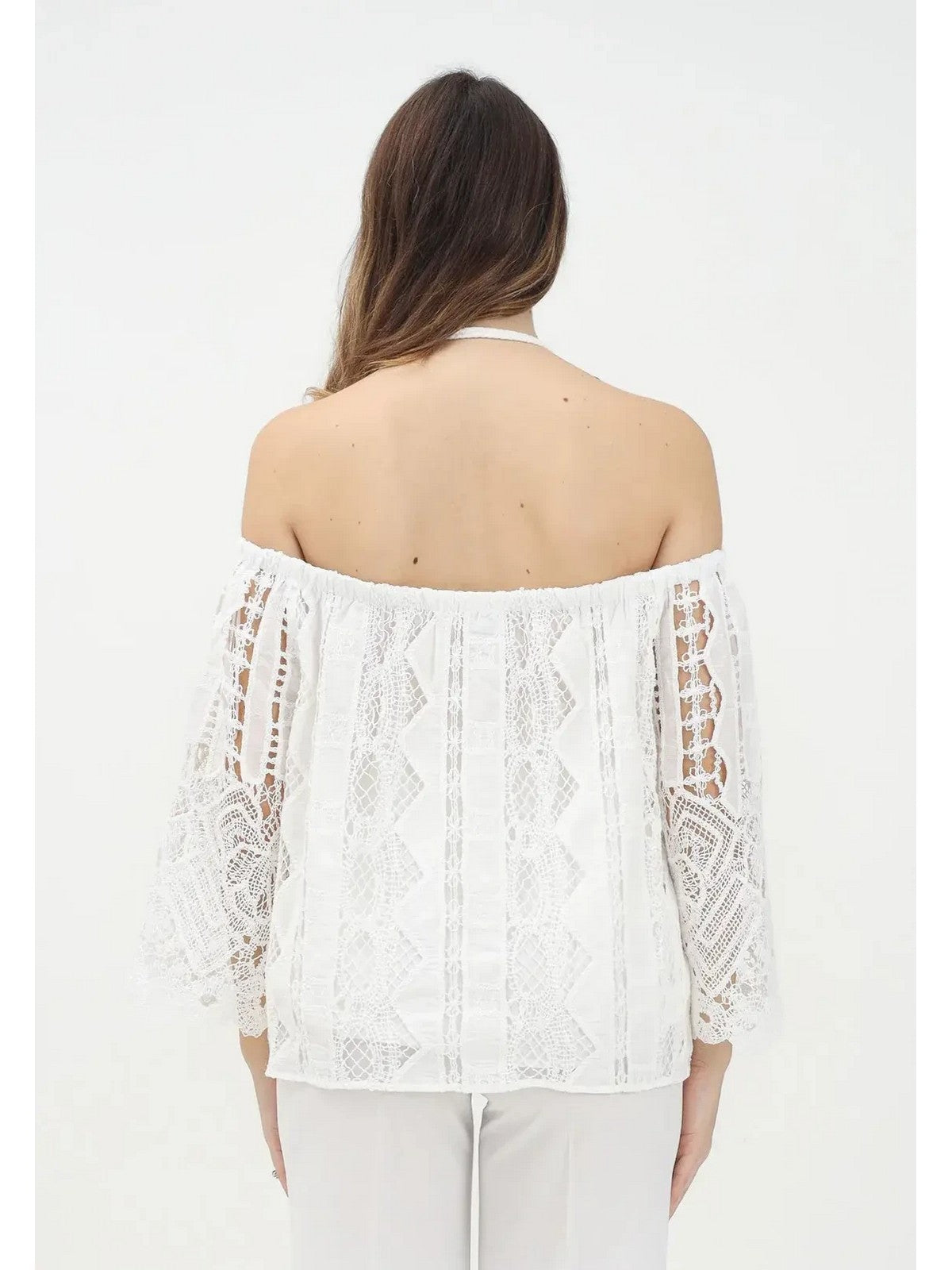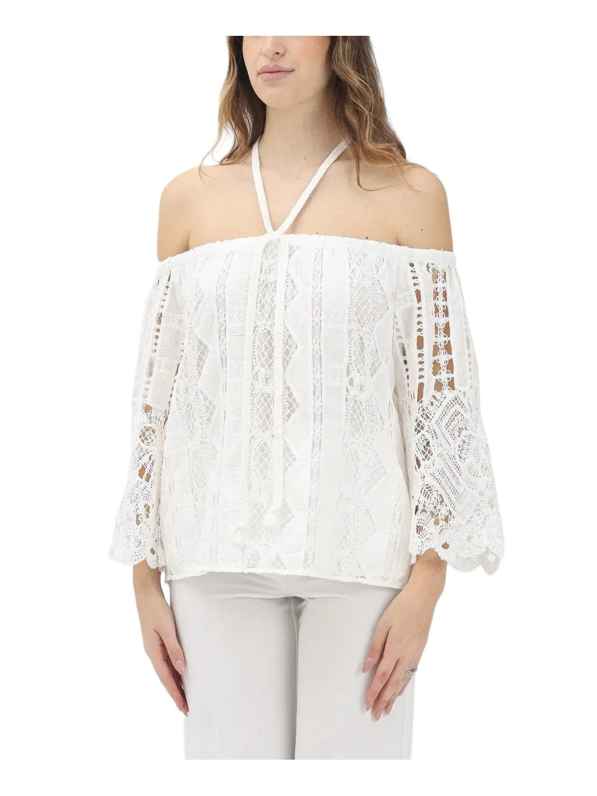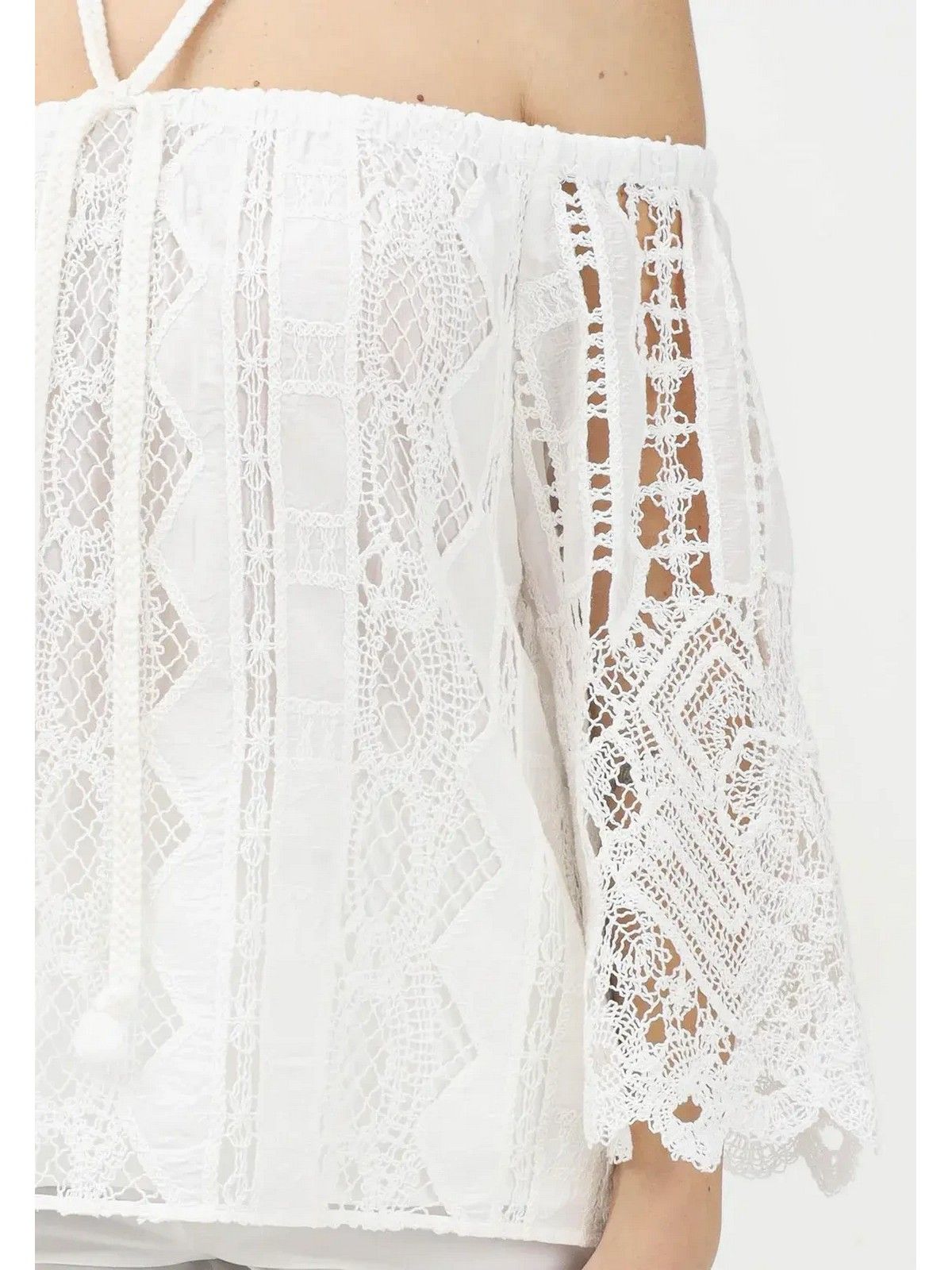 PINKO Top bianco da donna con spalle scoperte e laccio al collo, caratterizzato da una lavorazione raffinata che unisce macramè e sangallo. Il motivo traforato corre lungo tutto il capo creando un elegante gioco di trasparenze. Le maniche ampie esaltano lo stile boho chic, rendendolo perfetto per look estivi freschi e femminili. La modella indossa una taglia S ed è alta 170cm. Si consiglia un lavaggio ed una stiratura a media temperatura. Stagione primavera estate.