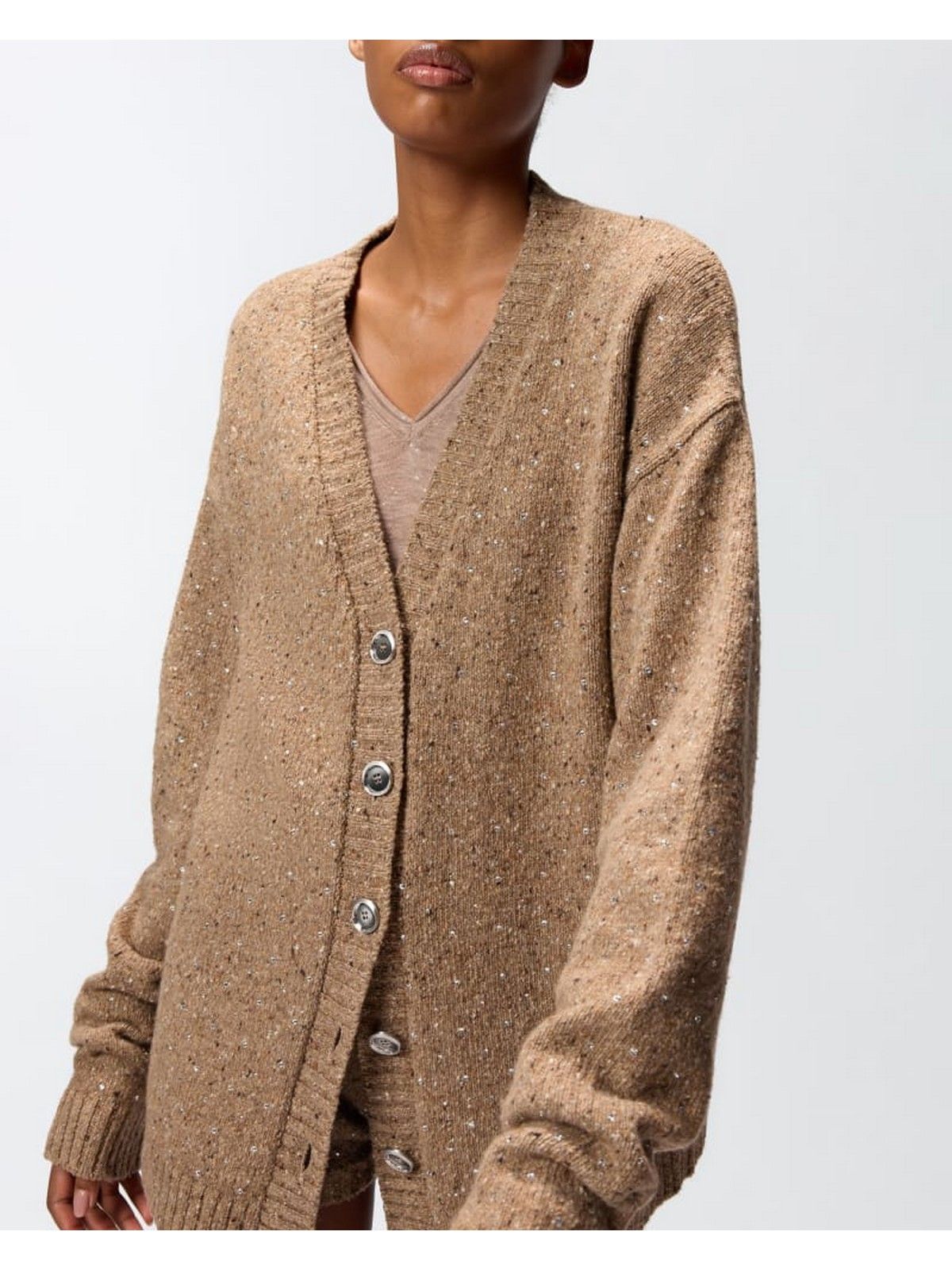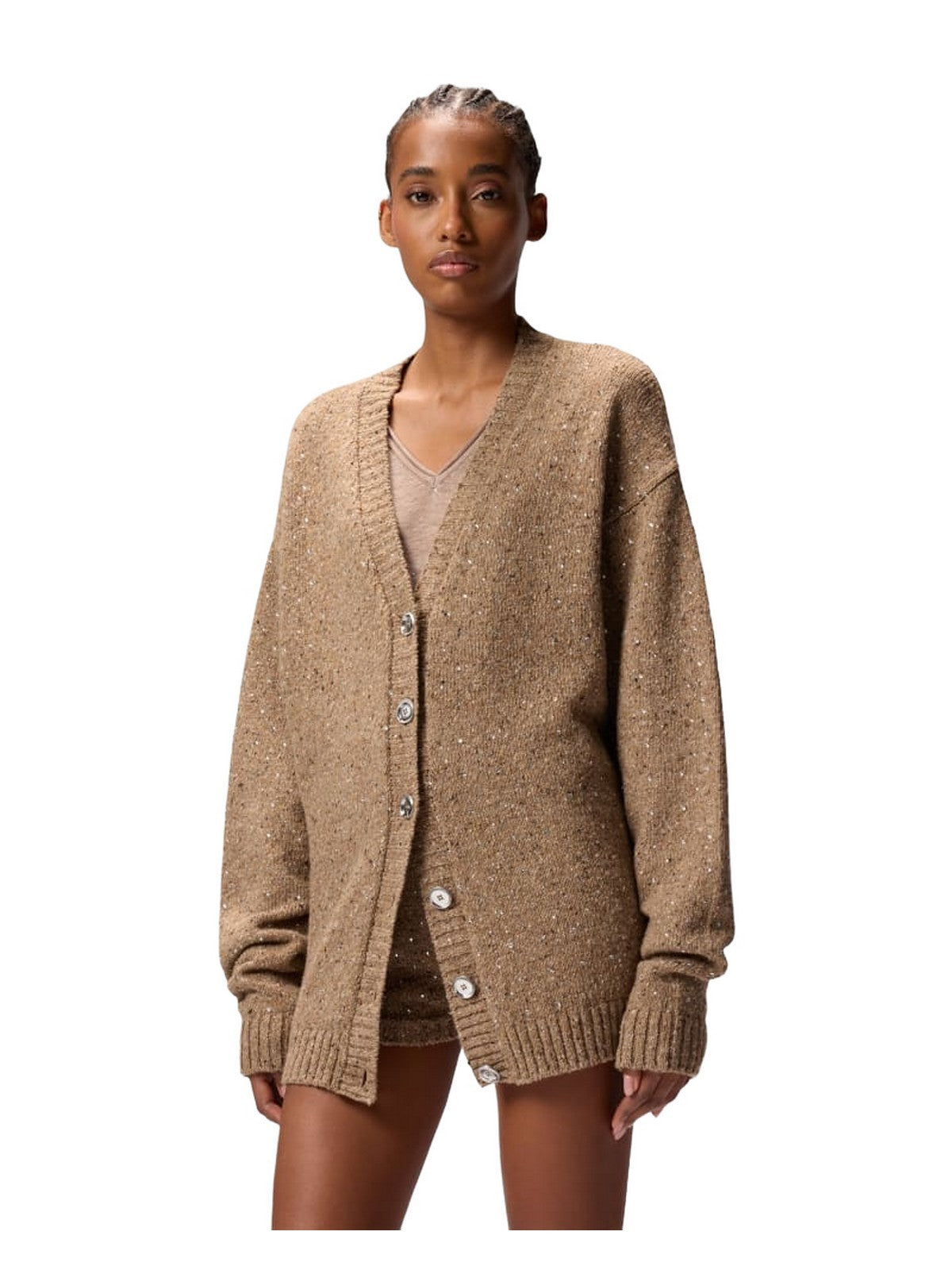 Cardigan a maniche lunghe dalla silhouette confortevole e avvolgente. Il soffice tessuto bouclé è costellato di strass che impreziosiscono il design. Orlo e polsini sono lavorati a coste, mentre dietro al collo spicca l'etichetta del brand tono su tono. Indossa il modello con gli shorts dello stesso colore per un total look che lascerà il segno anche nei momenti di relax. Il capo è stato sottoposto a prove di finissaggio per ridurre al minimo la possibile formazione di pilling, garantendo una maggiore morbidezza e durabilità del tessuto