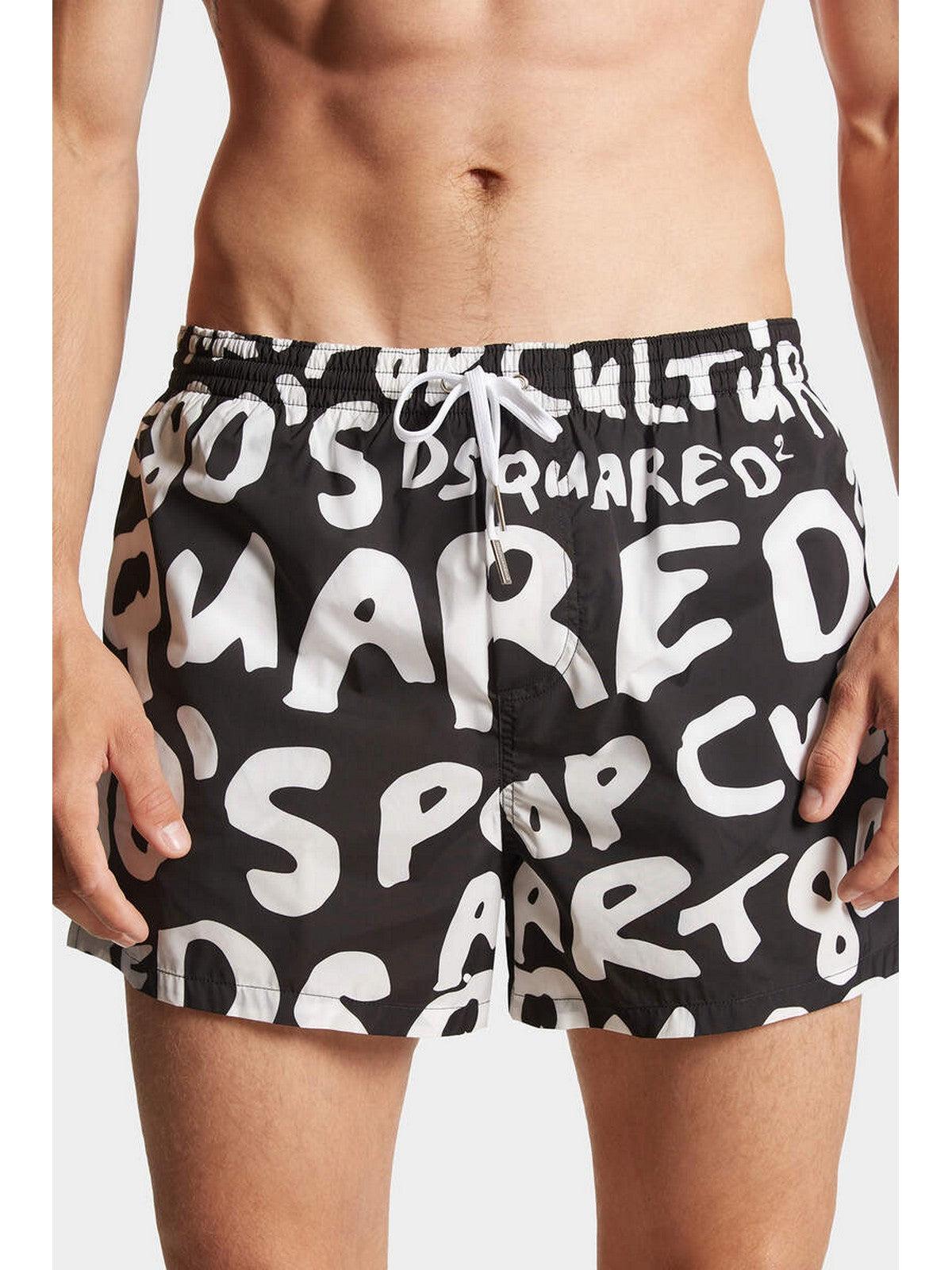 Costume da mare DSQUARED2 a metà coscia, in nylon. Caratterizzato da una stampa all over ispirata al tema di collezione dedicato alla Pop Art anni '80. Elastico in vita e coulisse con finalino di metallo logato. Il tessuto, morbido e confortevole, si asciuga rapidamente.