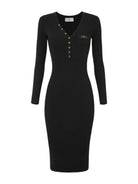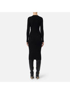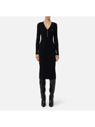 Abito a tubino ELISABETTA FRANCHI in maglia dalla vestibilità aderente. Il vestito ha scollo a V con bottoni, maniche lunghe, gonna longuette. Si distingue per l'elaborata lavorazione a costine che crea un mix di definizione e morbidezza. Il taschino in raso con logo in metallo dorato completa il capo.