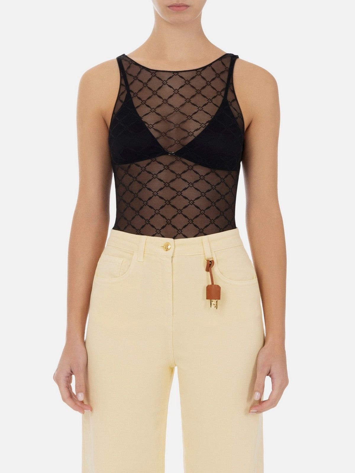 Un capo elegante e femminile, realizzato in tulle jacquard trasparente, che avvolge il corpo come una seconda pelle, enfatizzando la silhouette.