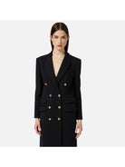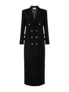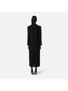 Cappotto ELISABETTA FRANCHI doppiopetto lungo in panno di lana con spalle strutturate, ampio rever a lancia, maniche con spacchetti. Dettagli che elevano lo stile: il taschino con pochette in mussola ricamata con logo e le patte con filetti in raso. Completano i bottoni in metallo dorato di gusto gendarmerie.