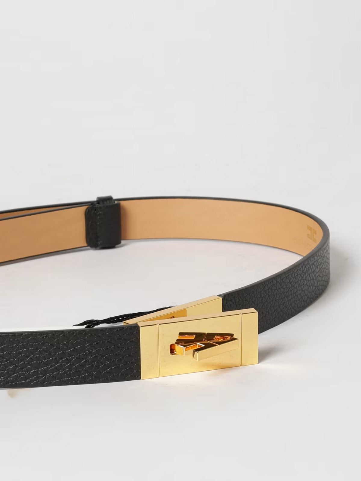 • Fibbia con logo in metallo dorato.