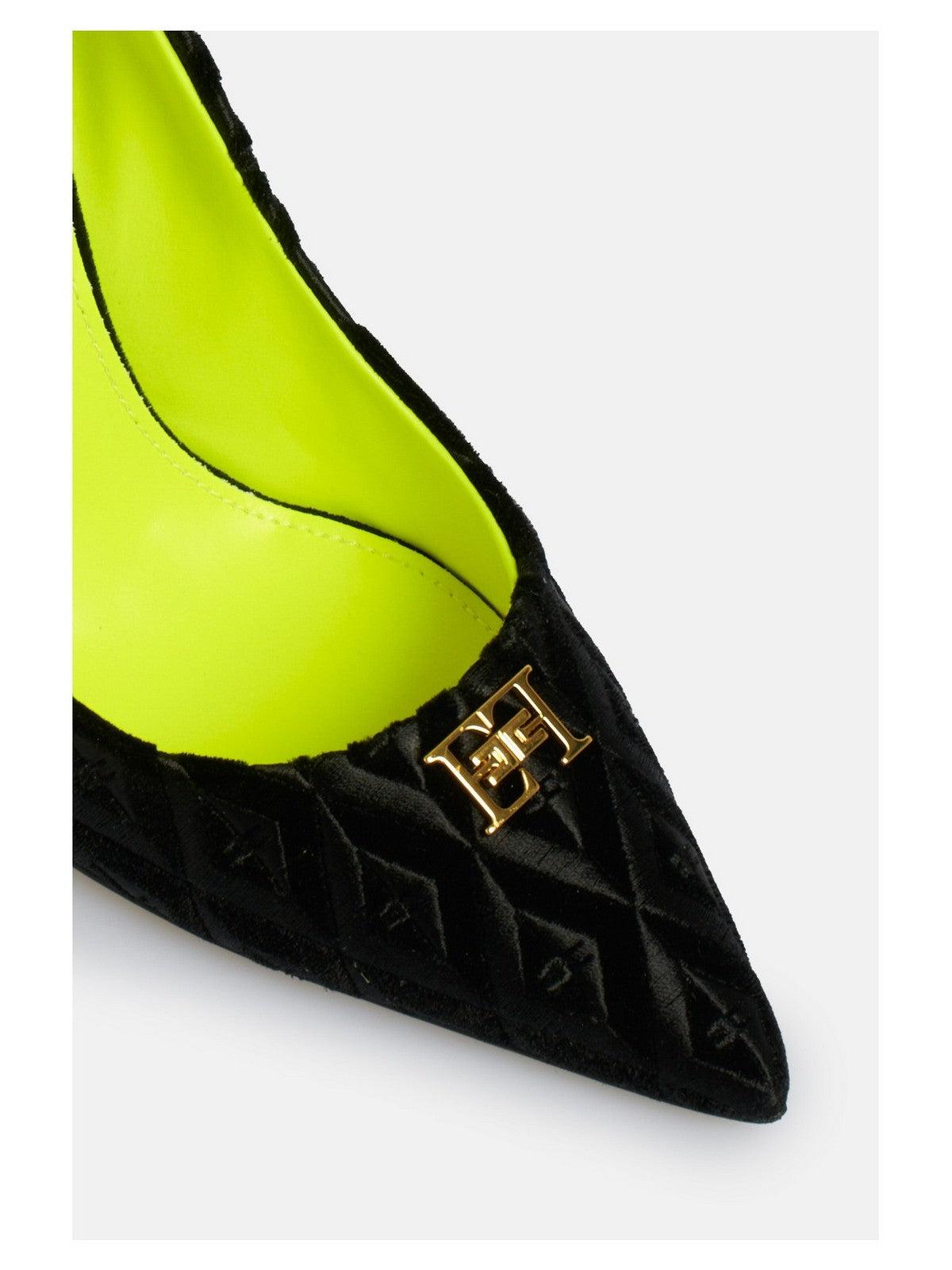 Décolleté ELISABETTA FRANCHI in velluto con motivo rombi matelassé all-over. Caratterizzato da tacco scultura e rivetto in metallo dorato