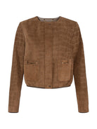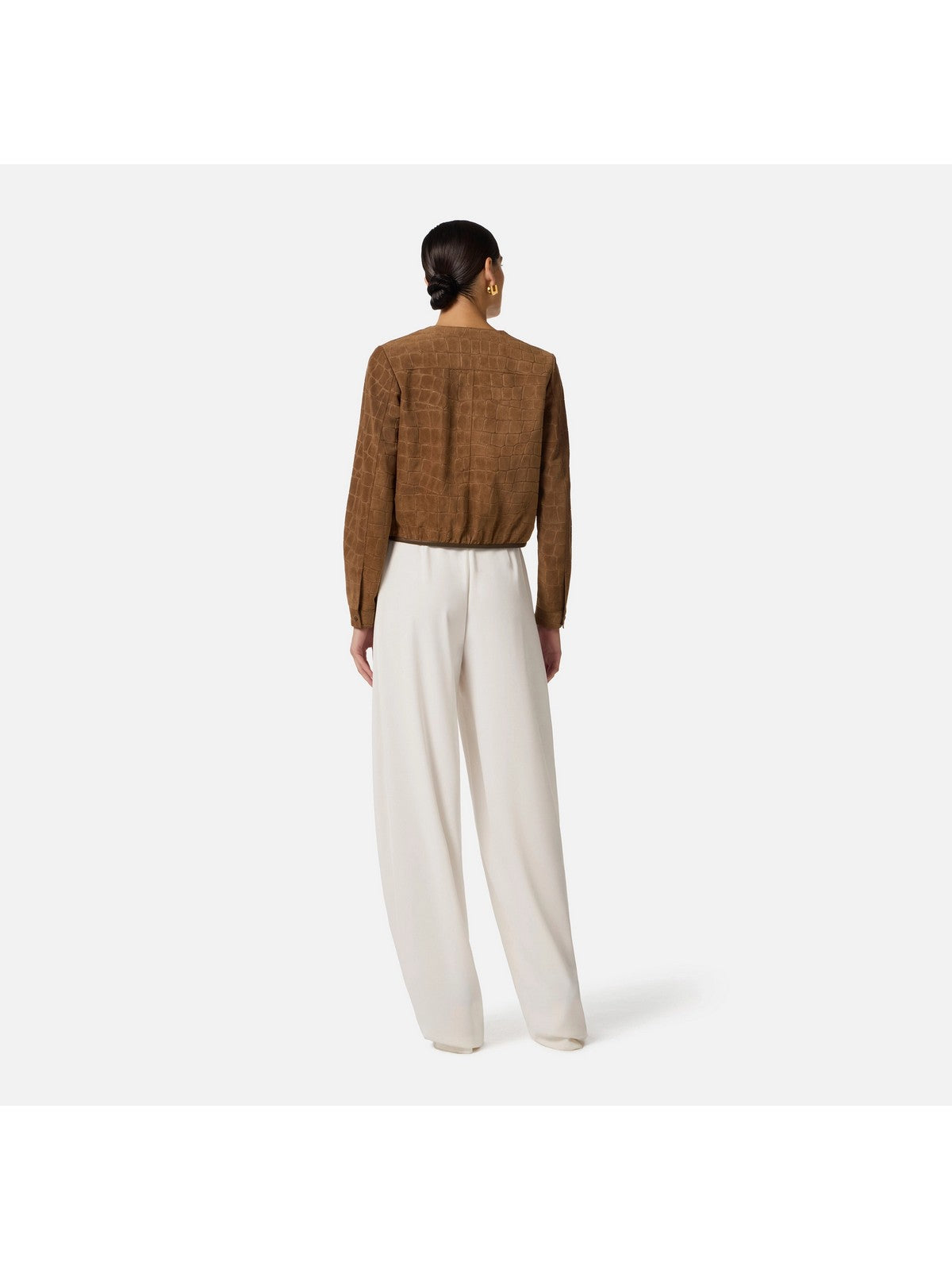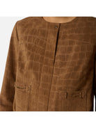 Giacca Elisabetta Franchi in suede, rifinita con bordi in nappa, è caratterizzata dalla stampa a tema alligatore