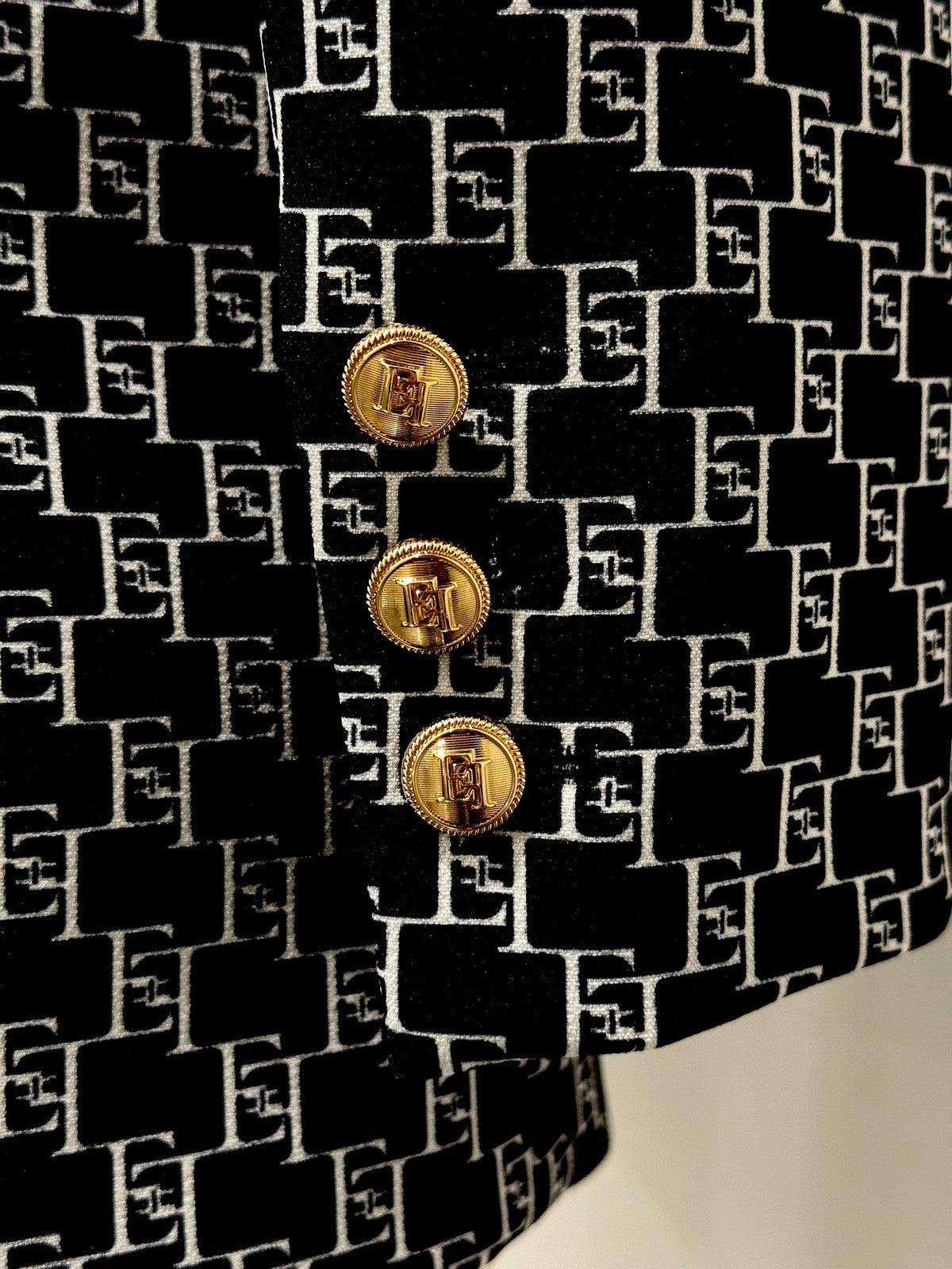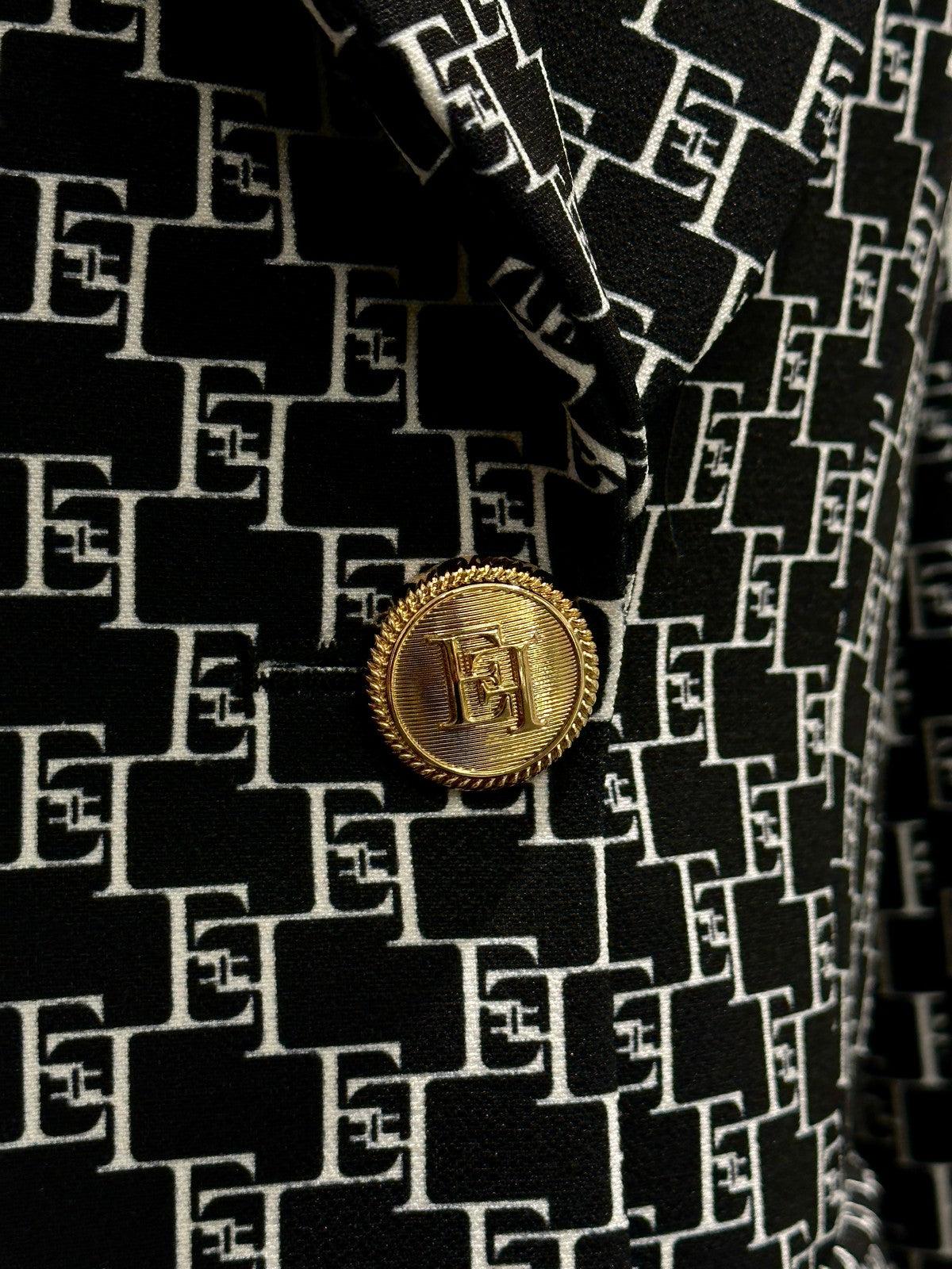 Giacca ELISABETTA FRANCHI in crêpe stretch stampa logo. Chiusura a monopetto con bottoni in metallo dorato. Tasche frontali con pattina. Revers sciallato e fodera in raso monogram.