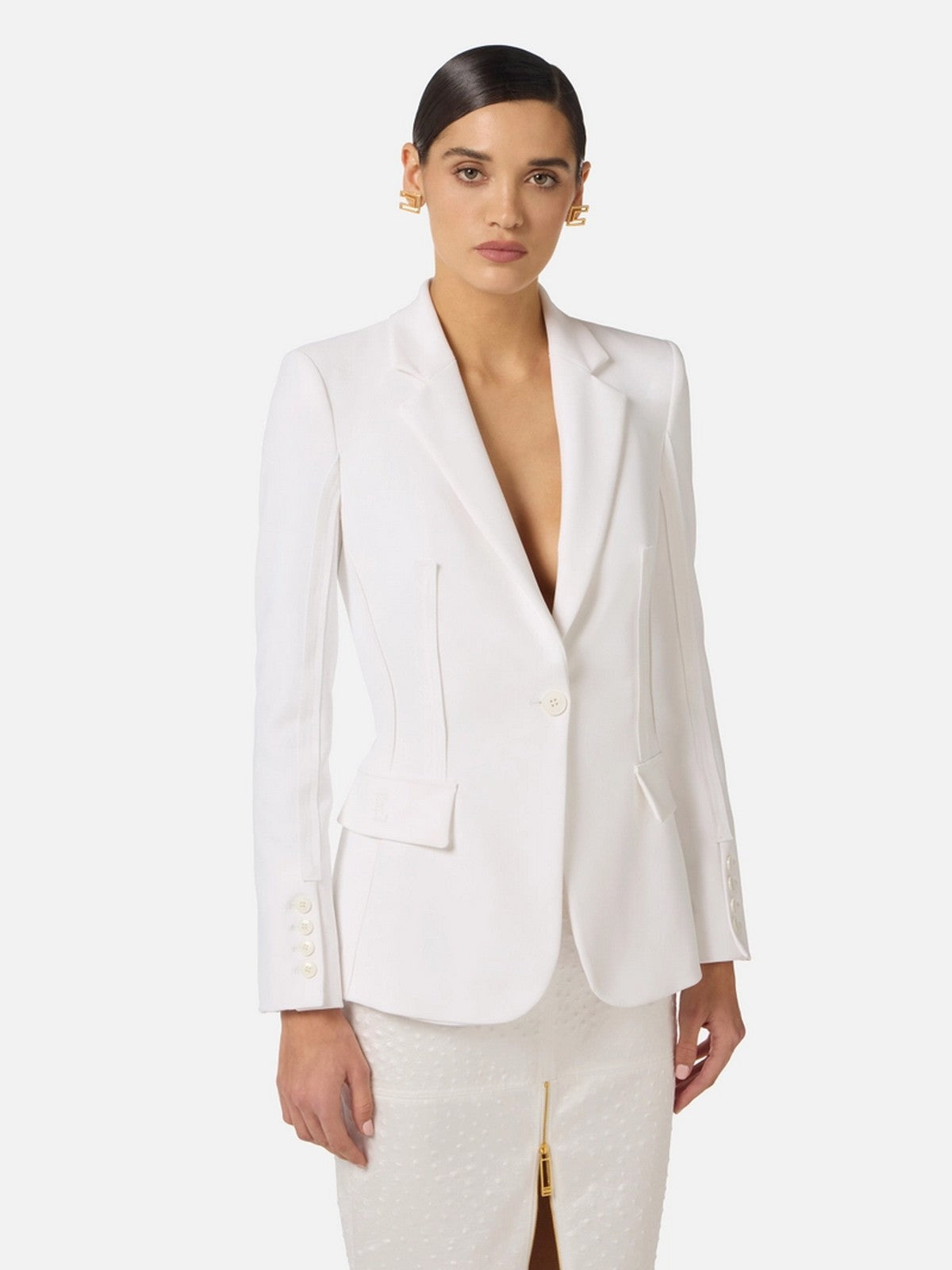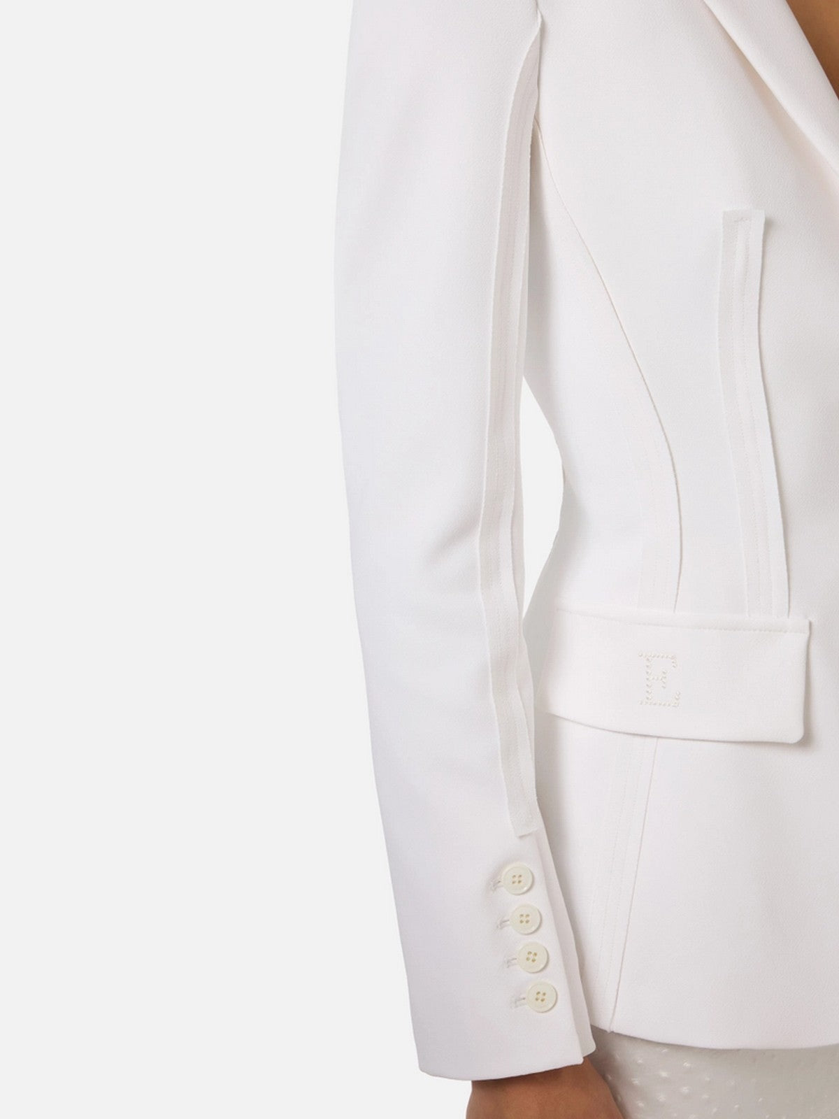 Giacca ELISABETTA FRANCHI in doppio crêpe stretch, cuciture riportate esternamente, rifinite con tessuto a taglio vivo e impunture.