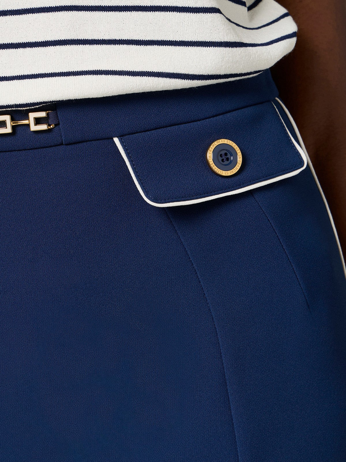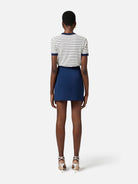 Questa minigonna è pensata per valorizzare la silhouette con eleganza moderna. Il design è impreziosito da un raffinato morsetto gioiello con logo smaltato, posizionato strategicamente sul fascione per un tocco distintivo. I dettagli di piping a contrasto aggiungono definizione al capo, mentre i bottoni con ghiera in metallo dorato richiamano uno stile sofisticato e senza tempo. Una scelta ideale per chi cerca un equilibrio perfetto tra classe e femminilità.