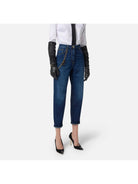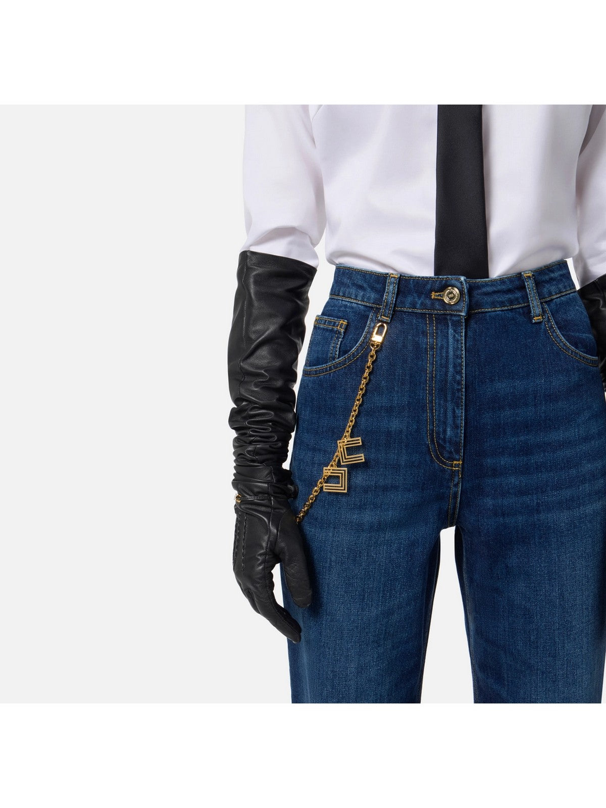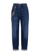 Jeans ELISABETTA FRANCHI in denim dalla vita regolare con costruzione a ovetto e risvolto al fondo. Ispirati agli intramontabili modelli cinque tasche, sono impreziositi dall'accessorio in catena con logo pendente in metallo dorato. Etichetta con logo sul retro. Vestibilità regular.