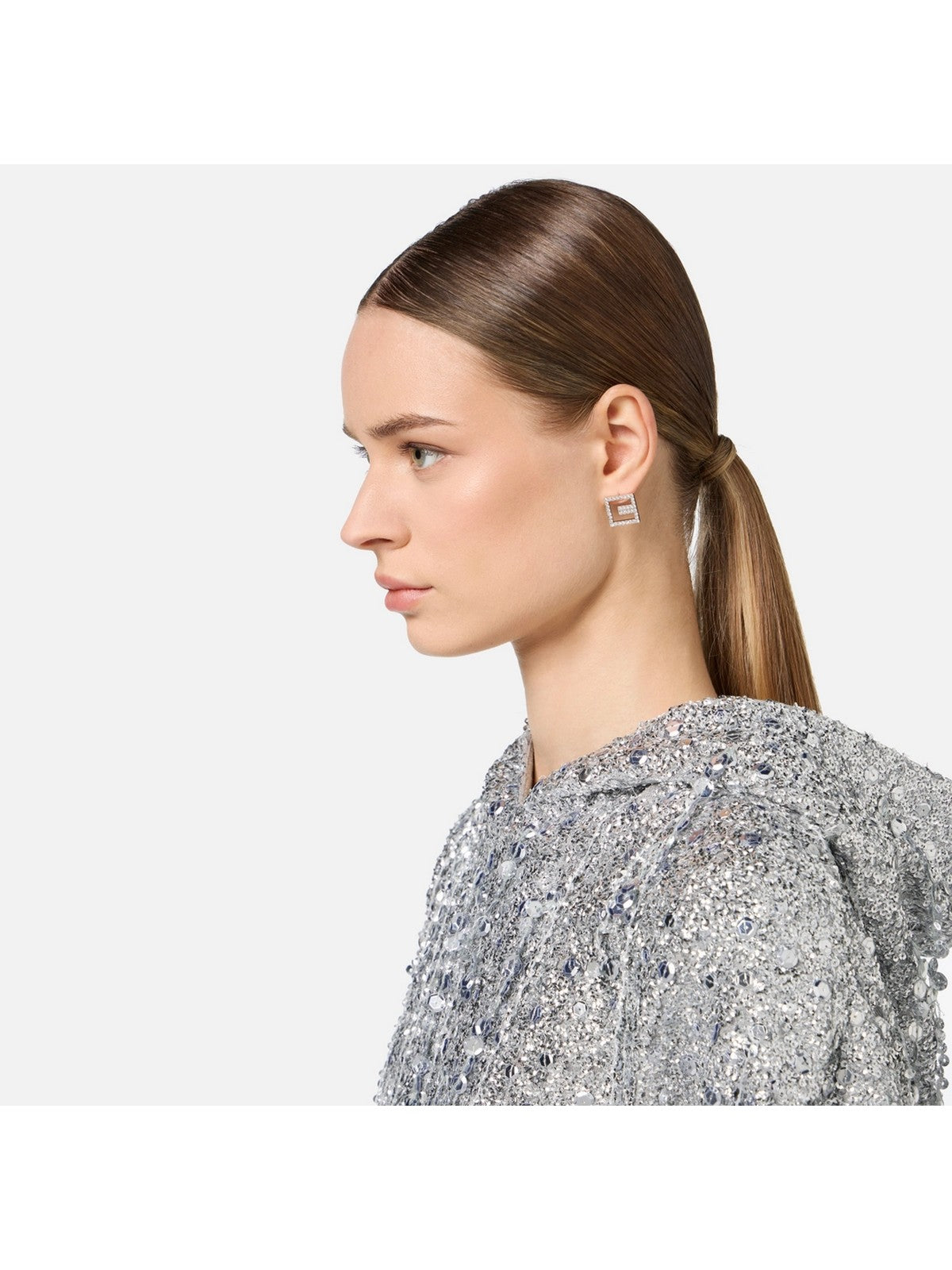 Orecchini outline ELISABETTA FRANCHI logo con ago e farfallina in metallo silver intarsiati di strass.
