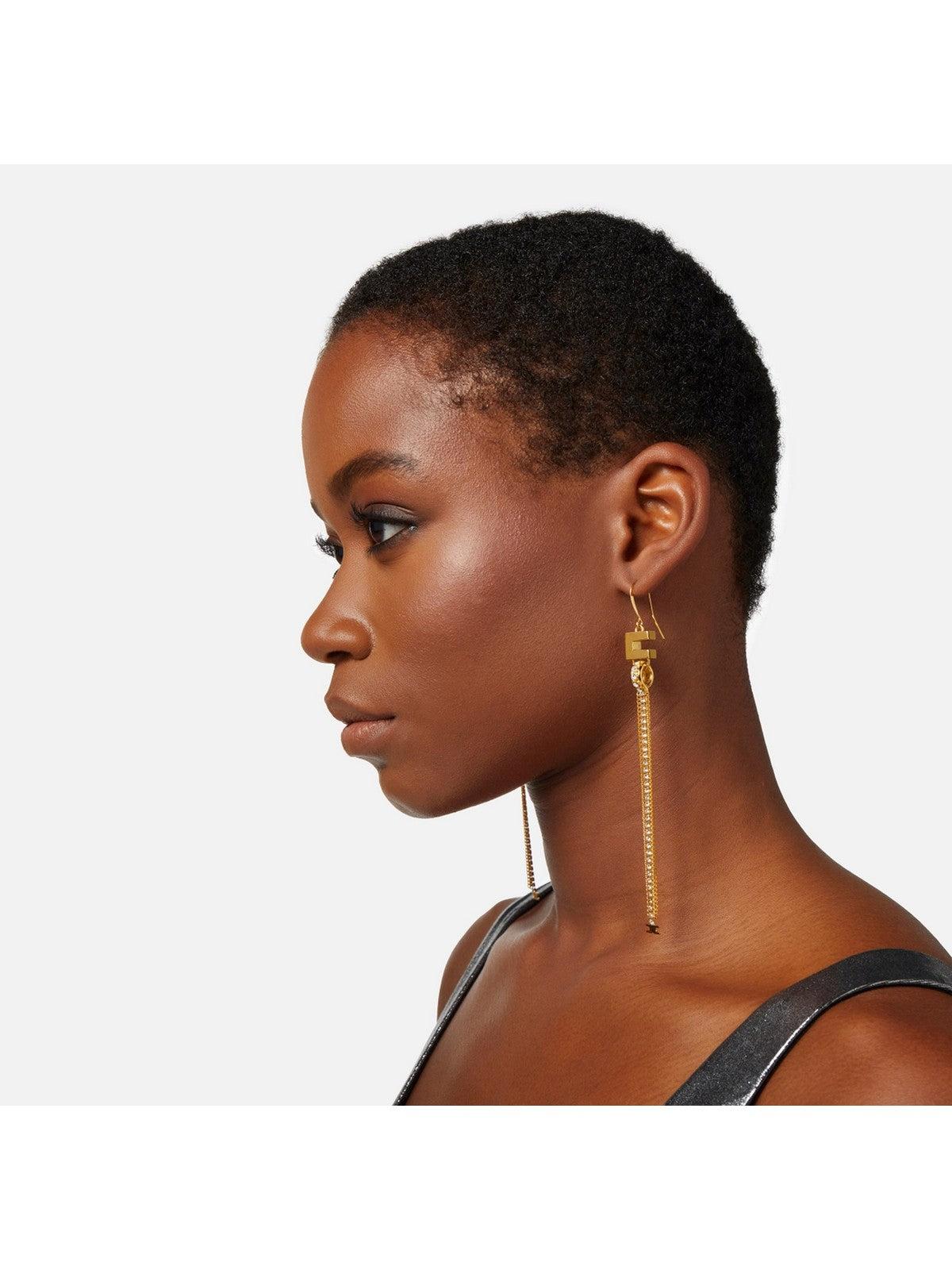 Orecchini ELISABETTA FRANCHI con monachella in metallo dorato e lunghi pendenti costituiti da micro groumette in strass che terminano con charms logo.