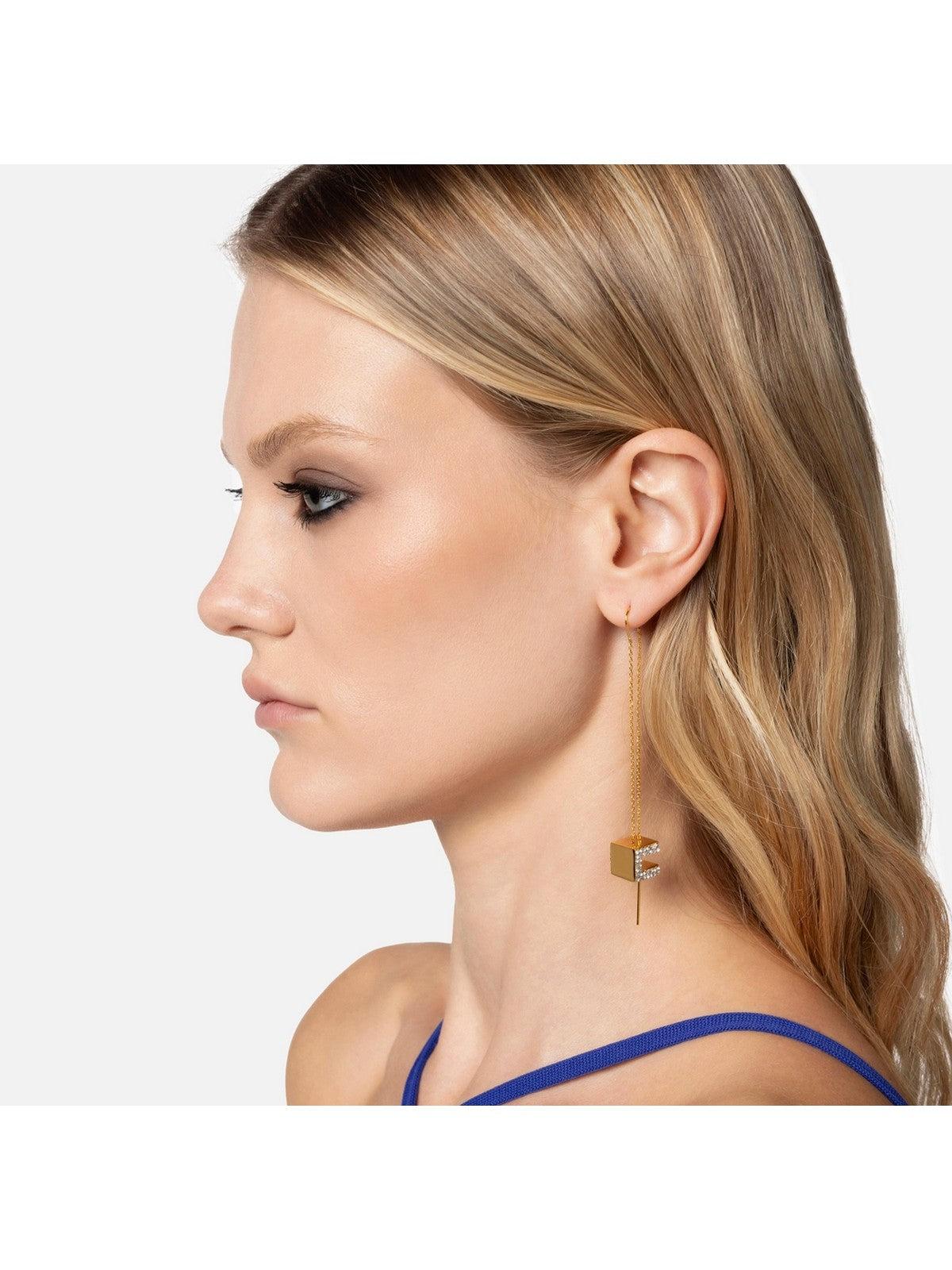 Orecchini ELISABETTA FRANCHI con monachella in metallo silver e lunghi pendenti costituiti da micro groumette che terminano con charms logo intarsiati di strass.