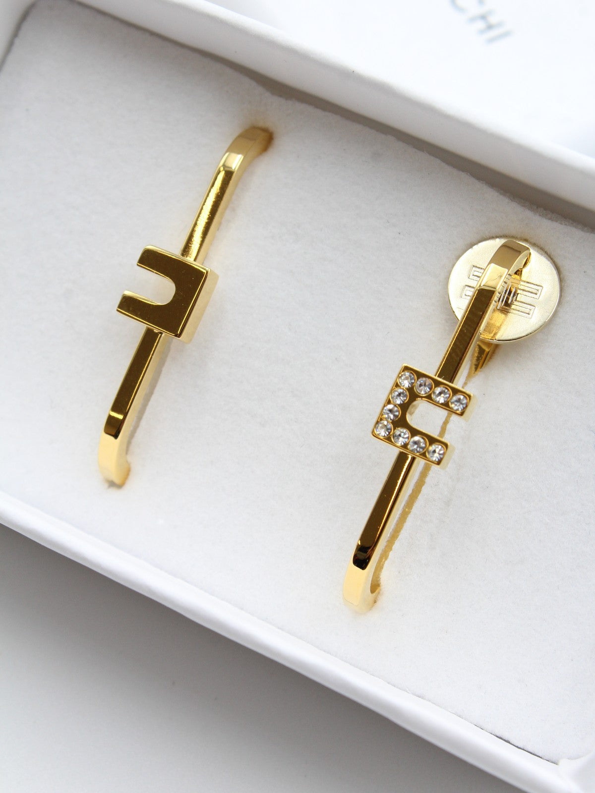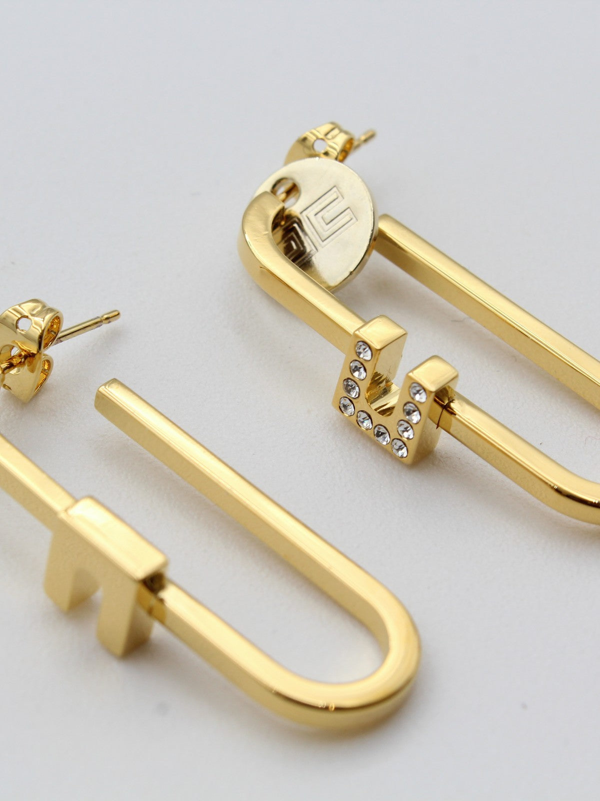 Questi orecchini sono l'incarnazione di un'eleganza discreta e sofisticata. Il design raffinato presenta un delicato logo al centro, impreziosito da piccoli strass che riflettono la luce con un tocco di brillantezza sottile ma affascinante. La chiusura a scatto assicura una perfetta sicurezza e comfort, rendendoli ideali per l'uso quotidiano senza rinunciare alla praticità.