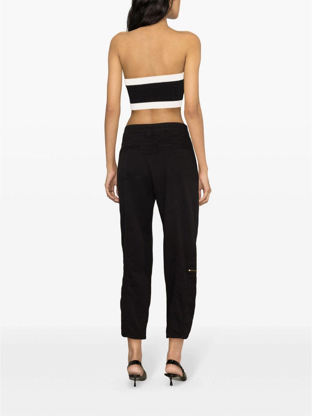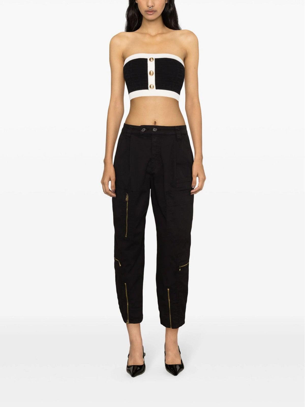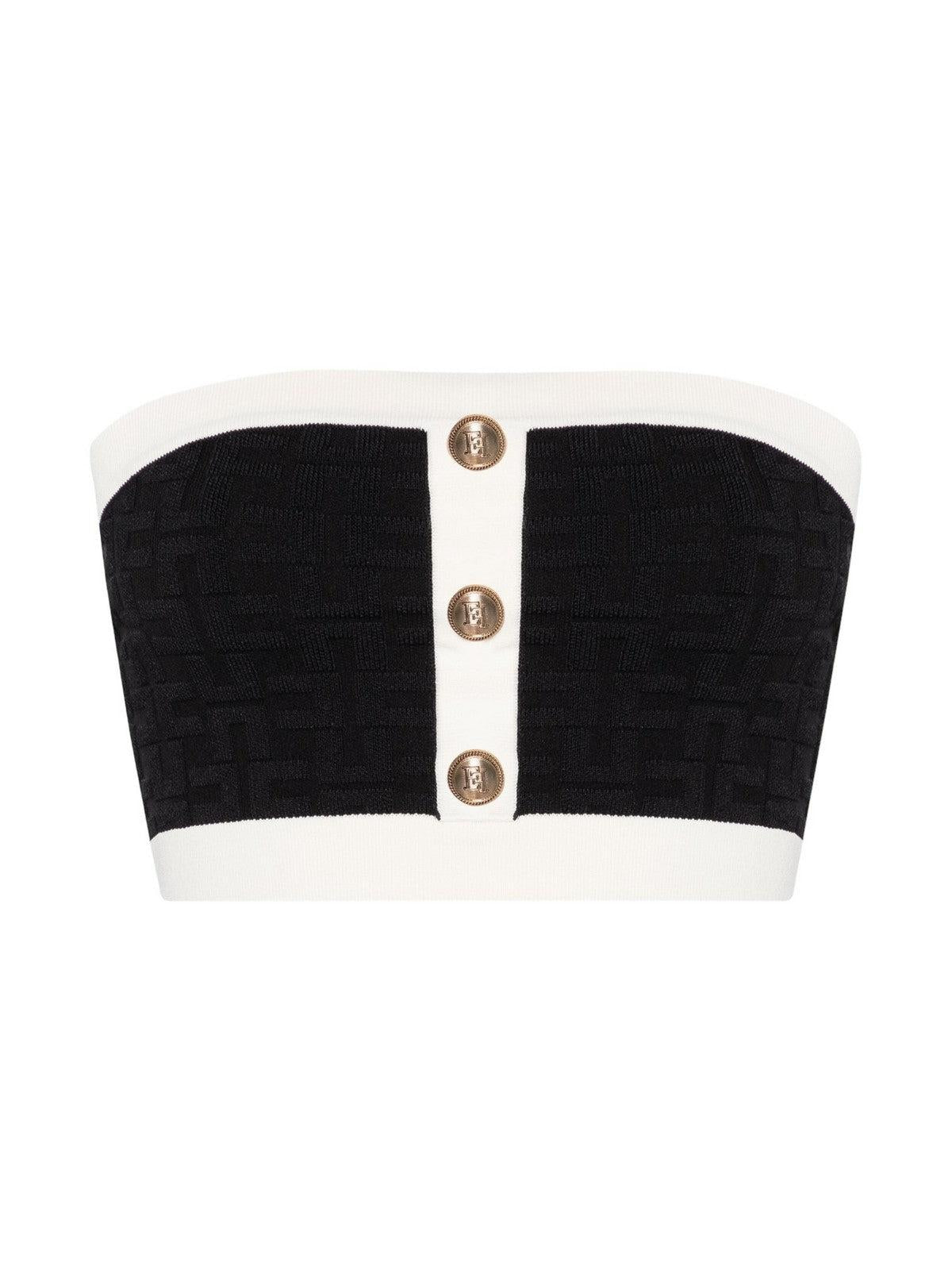 Top ELISABETTA FRANCHI in viscosa embossed con logo doppia C all-over e finiture in contrasto di colore. Modello a fascia. Scollo a madonna impreziosito da bottoni in metallo dorato. Vestibilità aderente.
