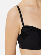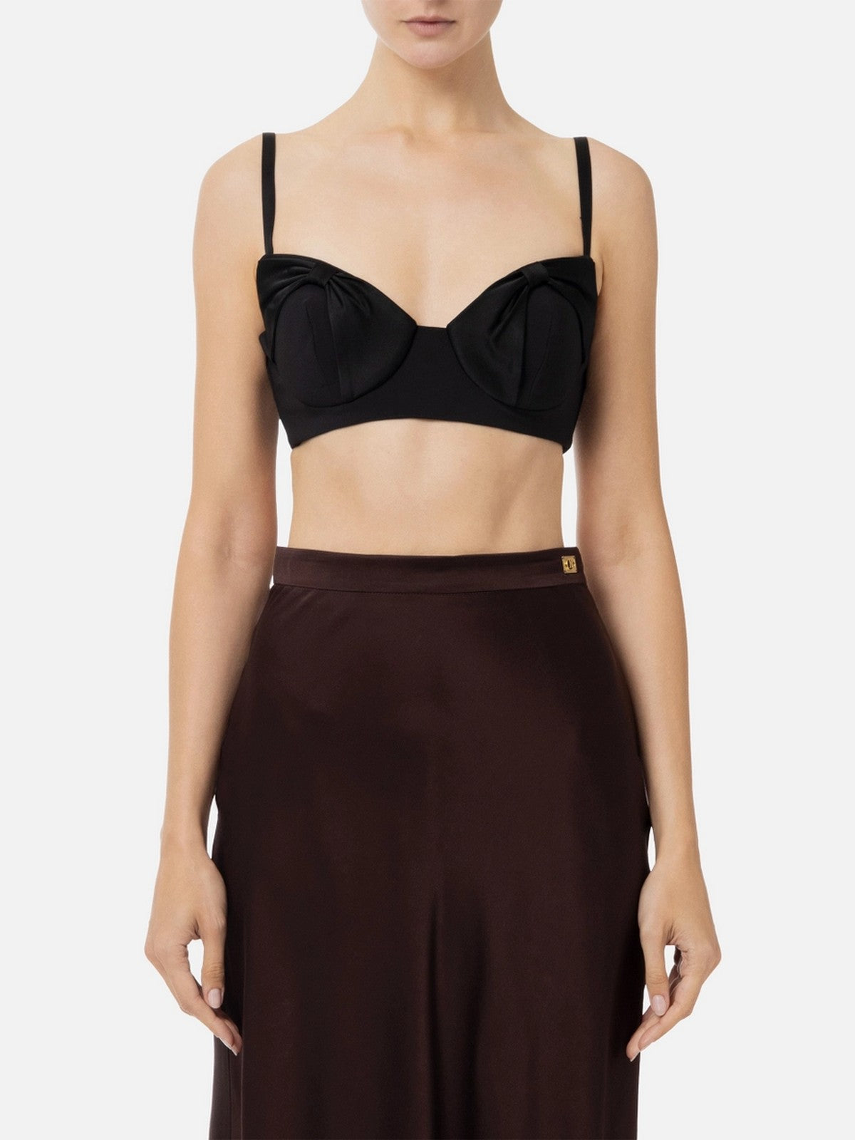 Le coppe sono ingentilite da raffinati fiocchi in raso, che aggiungono un tocco femminile e sofisticato. La vestibilità è resa pratica e confortevole grazie alla chiusura con zip sul retro, per un look impeccabile in pochi secondi.