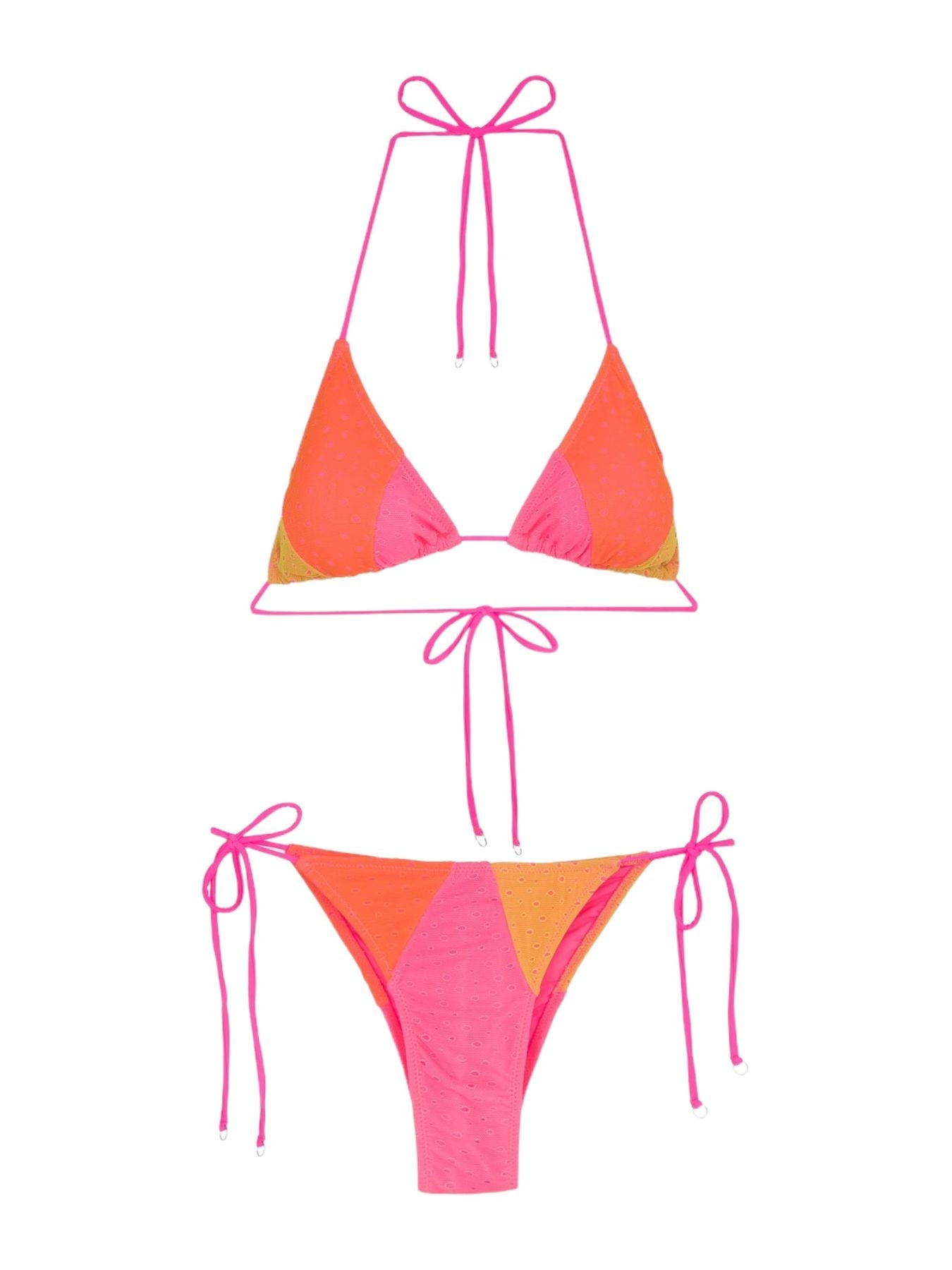 Bikini F**K n tulle traforato fucsia fluo. Modello a triangolo con slip laccetti regolabile.