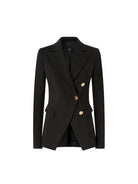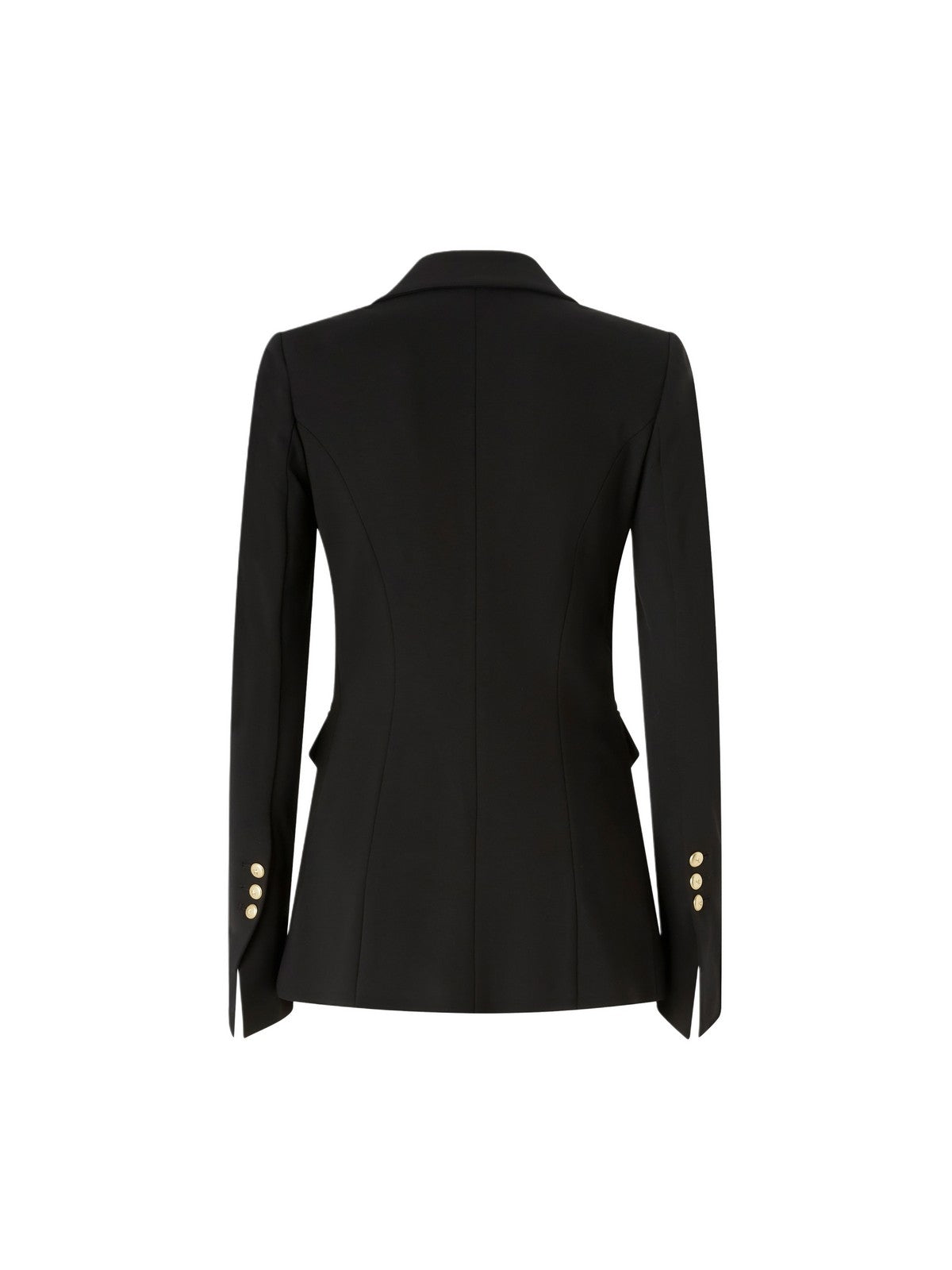 Giacca blazer elegante da donna realizzata in tessuto tecnico di viscosa stretch lavorato a punto stoffa, una speciale lavorazione che conferisce al tessuto una texture compatta e liscia. La vera protagonista del design è però la chiusura con bottoni decorati da stella, disposti in maniera tale da creare un particolare effetto di abbottonatura doppiopetto asimmetrica. Il capo presenta il carré posteriore foderato per garantire comfort e migliorare l'indosso, mentre il resto dell'interno è sfoderato per sfruttare al massimo il movimento del tessuto. Il modello presenta una vestibilità sfiancata, più aderente sui fianchi. Abbina il blazer con il pantalone nello stesso tessuto per un effetto tailleur, oppure indossa una camicia per un look formale, ma non troppo.