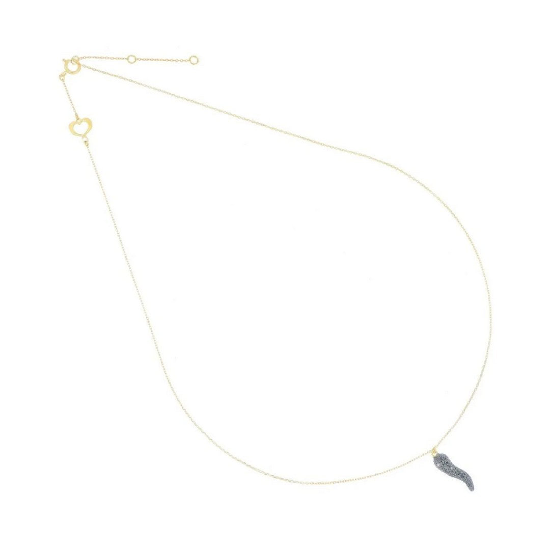 Collana girocollo della collezione Maman et Sophie Aurum Tié da donna. Colore: oro e argento. Il gioiello è realizzato in oro giallo 750? (18kt) e presenta un cornetto passante in polvere di diamanti cromo. Il girocollo può essere regolato in tre misure: 36,5 cm, 38,5 cm e 40,5 cm. All'estremità del girocollo è presente il cuore Maman traforato. Chiusura a moschettone.