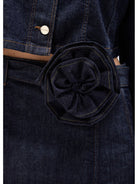 RILETTURA SARTORIALE DEL DENIM CON QUESTA GONNA PENCIL IN JEANS STRETCH ABBINATA A UNA CINTURA CON MAXI ROSA A SPILLA. HA LAVAGGIO RINSE SCURO, ZIP IN METALLO SUL RETRO, TASCHE APPLICATE, LUNGHEZZA MIDI. UN BASIC-NO-BASIC DA ABBINARE A TUTTO IL GUARDAROBA. COMPOSIZIONE: 98% COTONE 2% ELASTAN