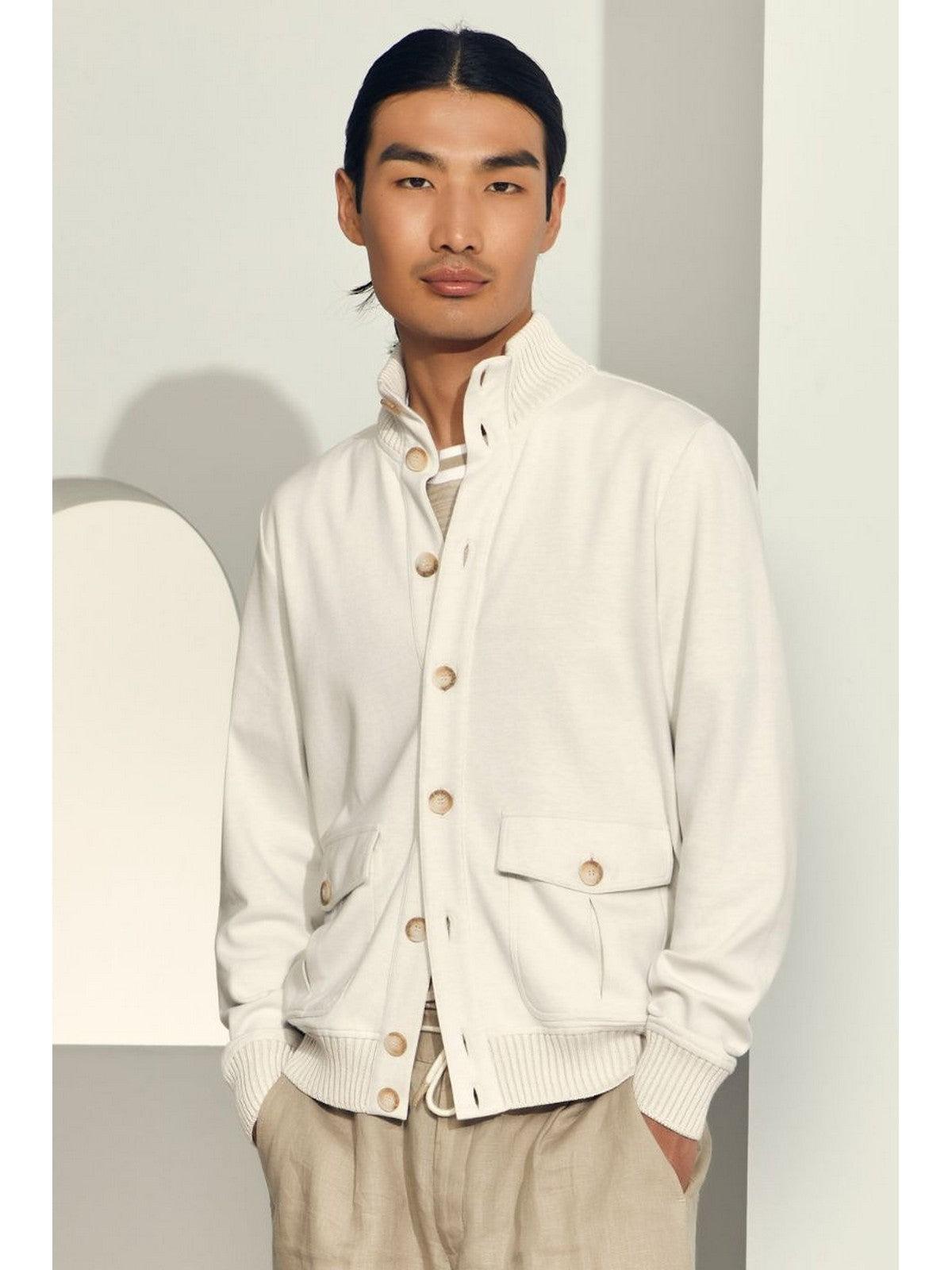 Giubbino GRAN SASSO in cotone. Chiusura centrale con 8 bottoni e due tasche laterali con patta e bottone. Lavorazione a coste sul collo, polsini e fondo.