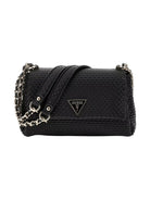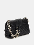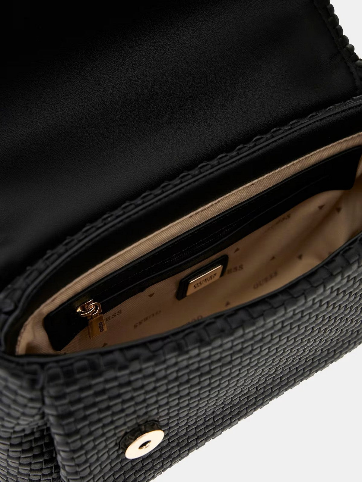 Borsa tracolla GUESS in simil pelle intrecciata. Triangolo logo in metallo frontale. Chiusura con patta e bottone automatico.