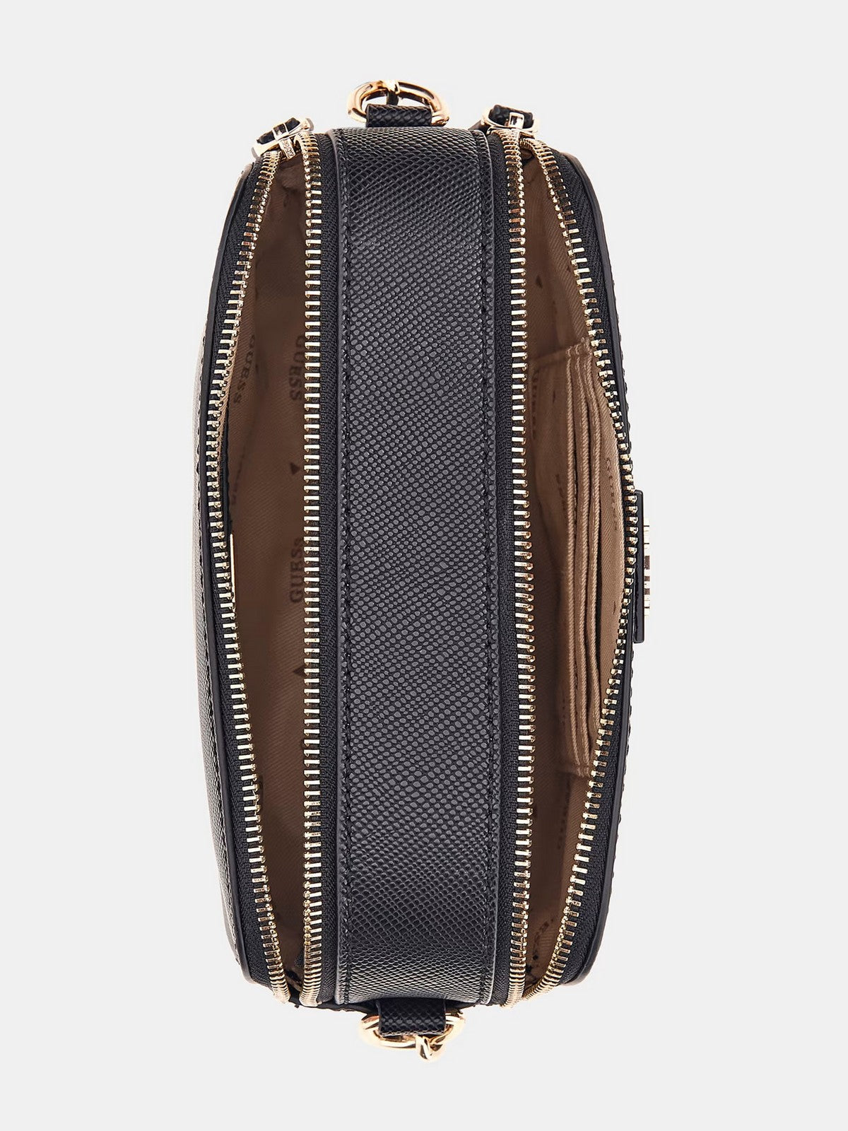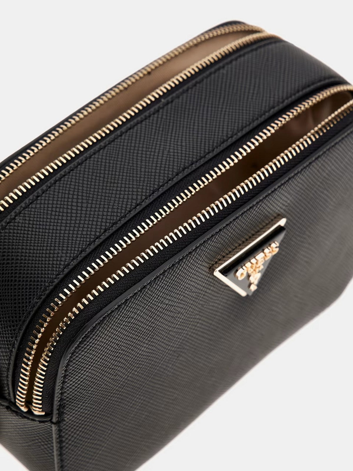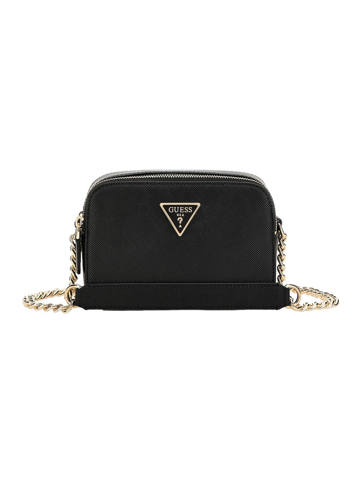 Tracolla GUESS in similpelle, lavorazione saffiano. Triangolo logo in metallo frontale.