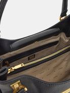 Tasca sul retro e laterali con cerniera lampo. Charm lucchetto alla base del manico. Interno con tre scomparti di cui uno centrale con zip. Fodera con logo.