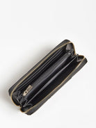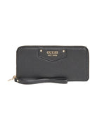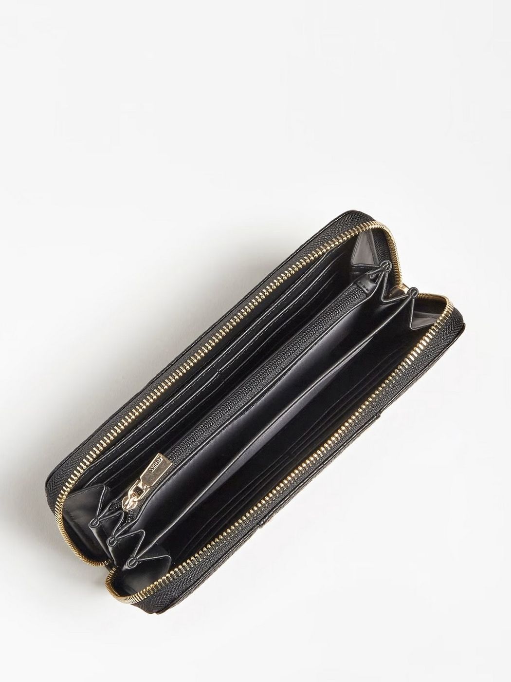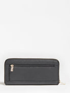 Portafoglio Guess in similpelle tinta unita, scritta logo in metallo. Chiusura con zip. All'interno scomparti per banconote, carte business e documenti, scomparto per monete con zip. Tasca esterna sul retro con zip. Misure 23x16x8 cm.