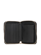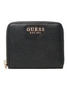 Portafoglio GUESS in similpelle lavorazione saffiano. Logo lettering in metallo frontale. Chiusura con zip. All'interno scomparti per carte business, banconote e documenti. Scomparto per monete.