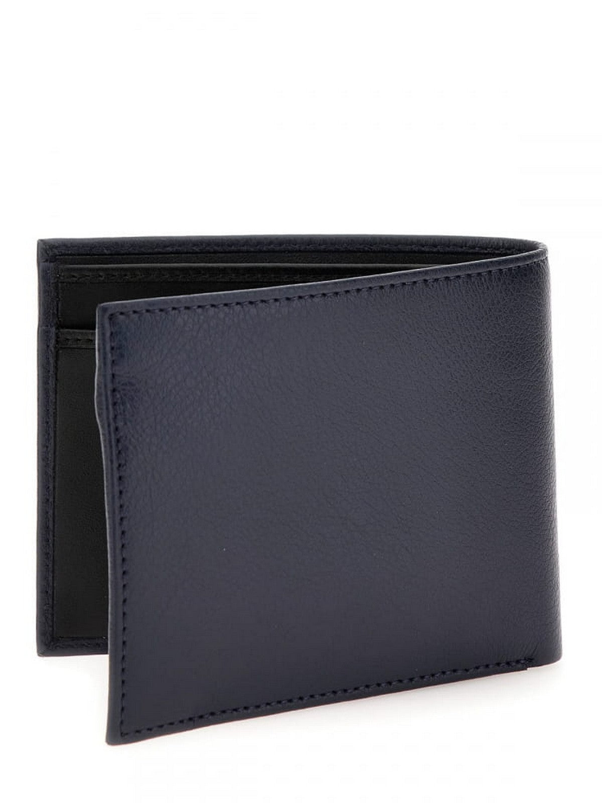Portafoglio uomo GUESS in pelle. Scritta logo a contrasto. All'interno scomparto per carte business, documenti e banconote. Scomparto per monete con chiusura.