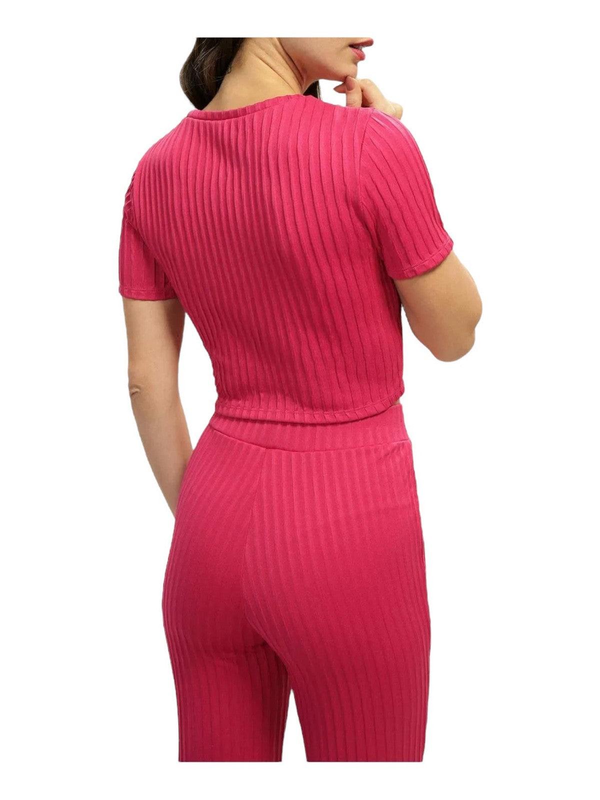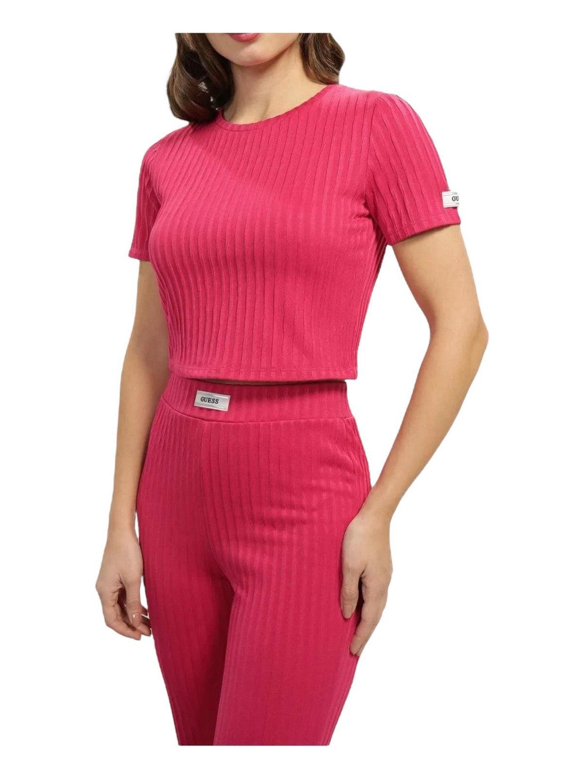 T-shirt GUESS cropped. Lavorazione a coste. Collo a giro e maniche corte. Targhetta logo applicata sulla manica.