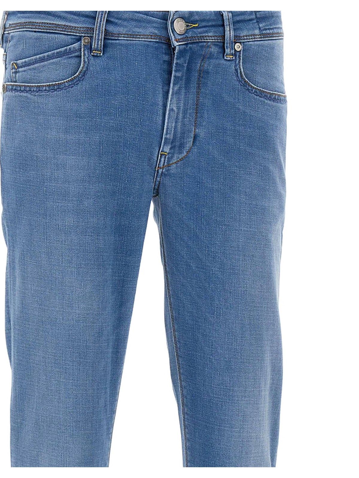 Jeans Re-Hash modello "Rubens Z" in denim blu scuro super comfort, caratterizzati da vita medio-bassa con passanti per cintura e costruzione a cinque tasche. Chiusura con zip e bottone logato, interno gamba 82 cm (taglia 34) e fondo 17 cm. Vestibilità slim per un look moderno e versatile.