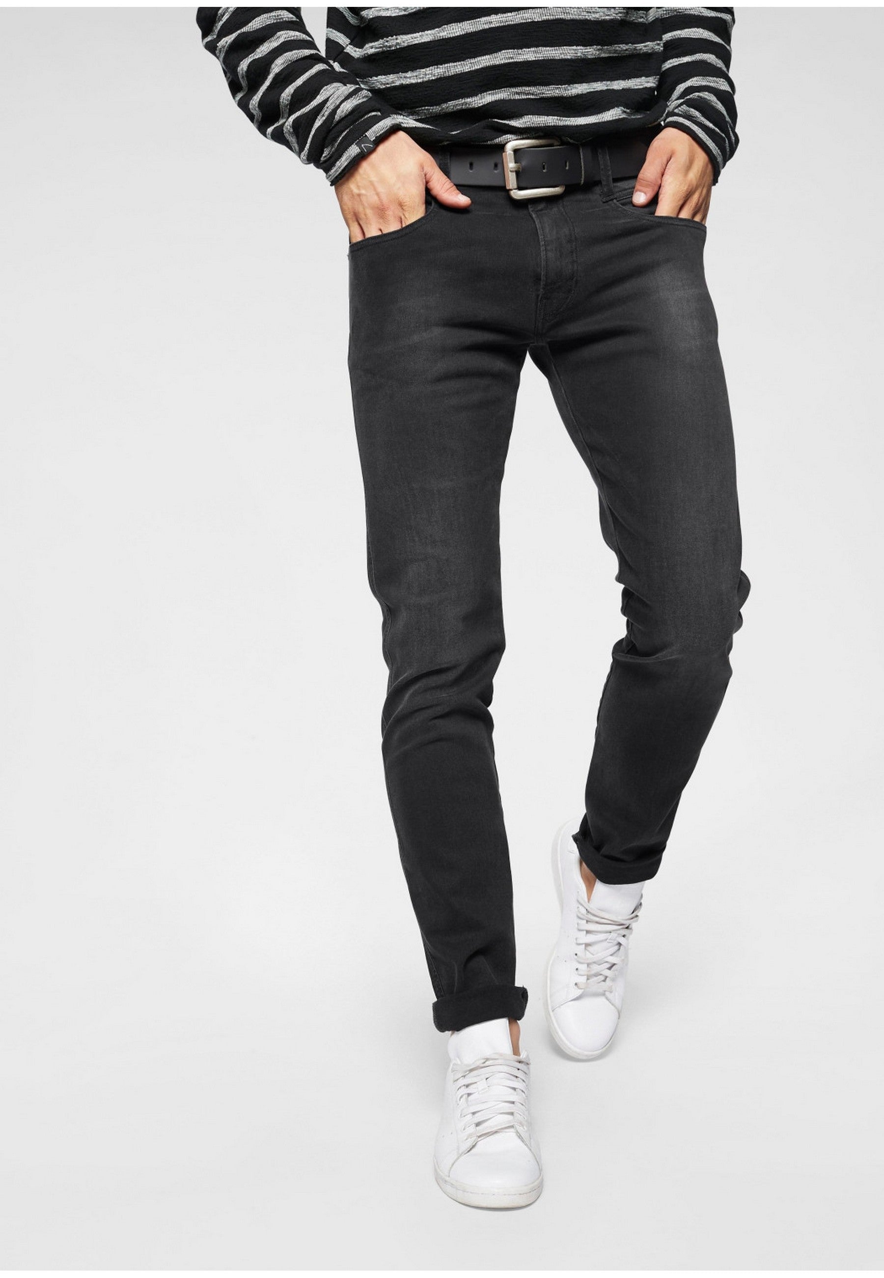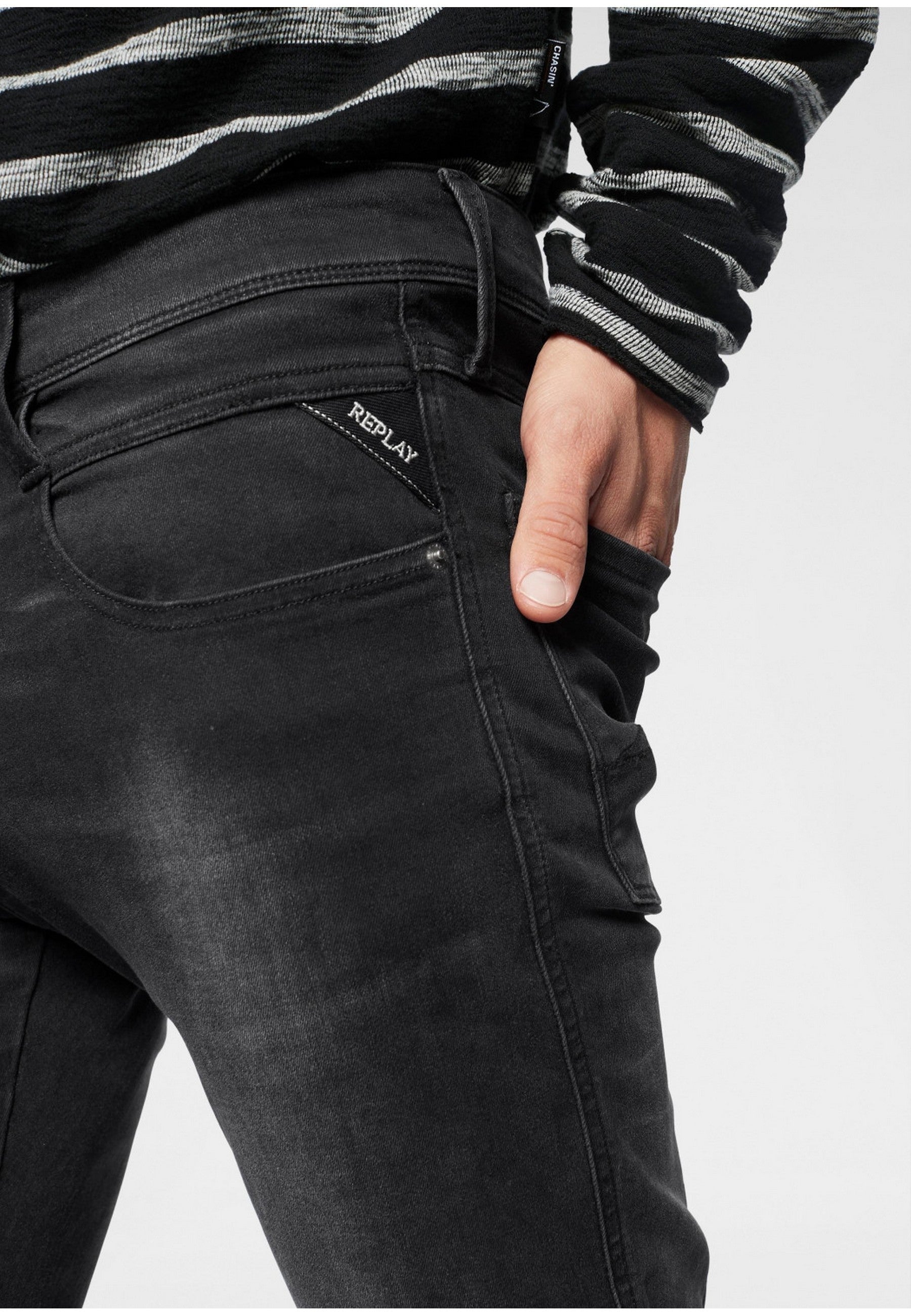 Jeans REPLAY in denim stretchLavaggio scuroVita regolareGamba slimChiusura con zip e bottone