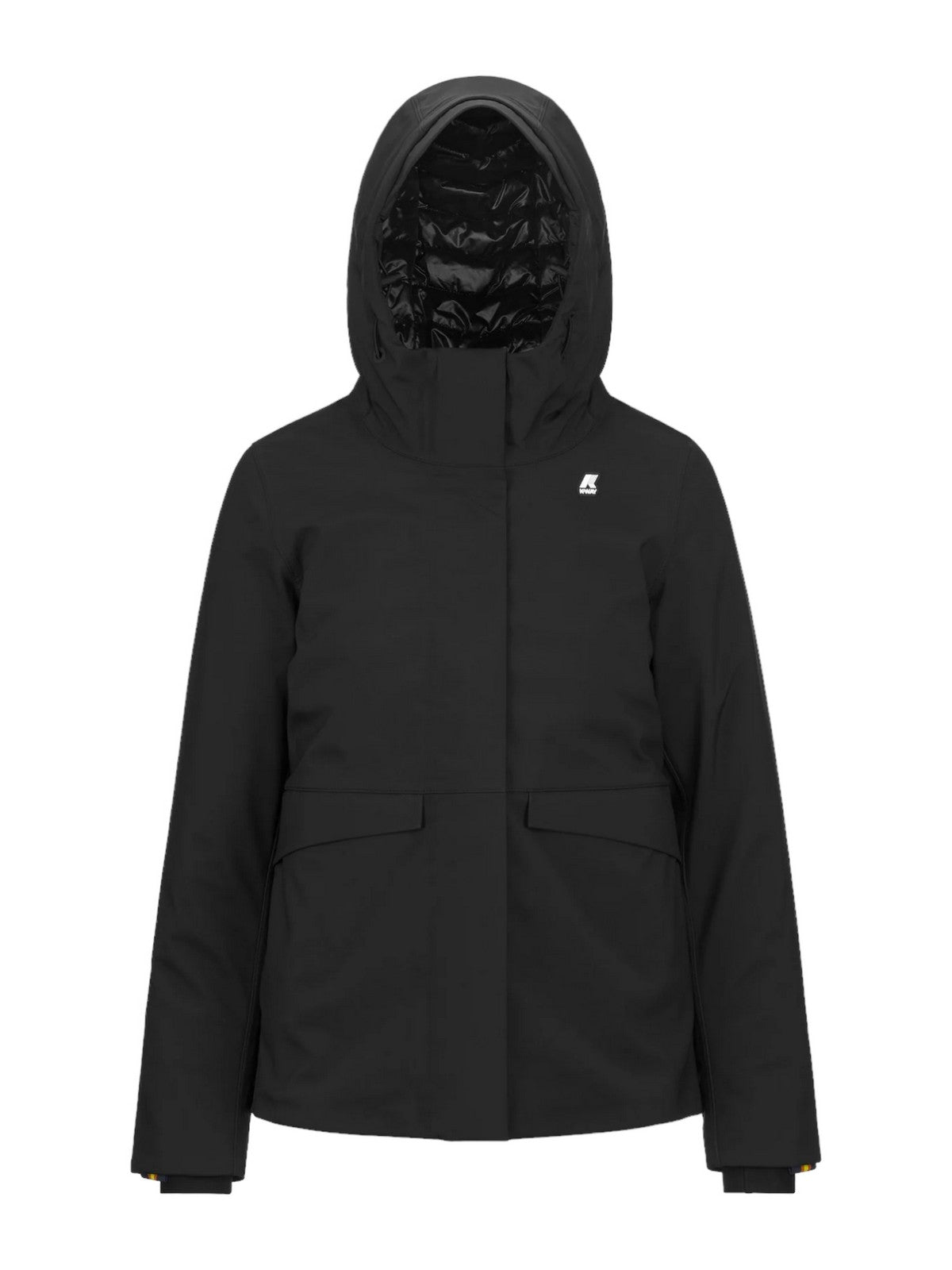 Giubbino donna K-WAY realizzato in tessuto accoppiato a 3 strati:nylon elasticizzato impermeabile, membrana e interno foderato in tessuto polar soffice.