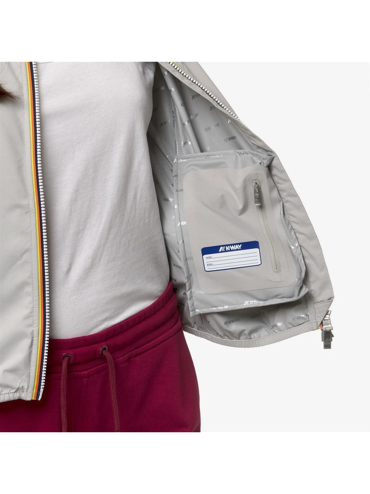 Giubbino K-WAY Lily in tessuto tecnico elasticizzato e riciclato, interno è foderato con una membrana isolante decorata con lettering K-Way stampato all over in tonalità argento. Collo con cappuccio e maniche lunghe con polsini e bordi con inserti elastici. Tasche laterali con zip