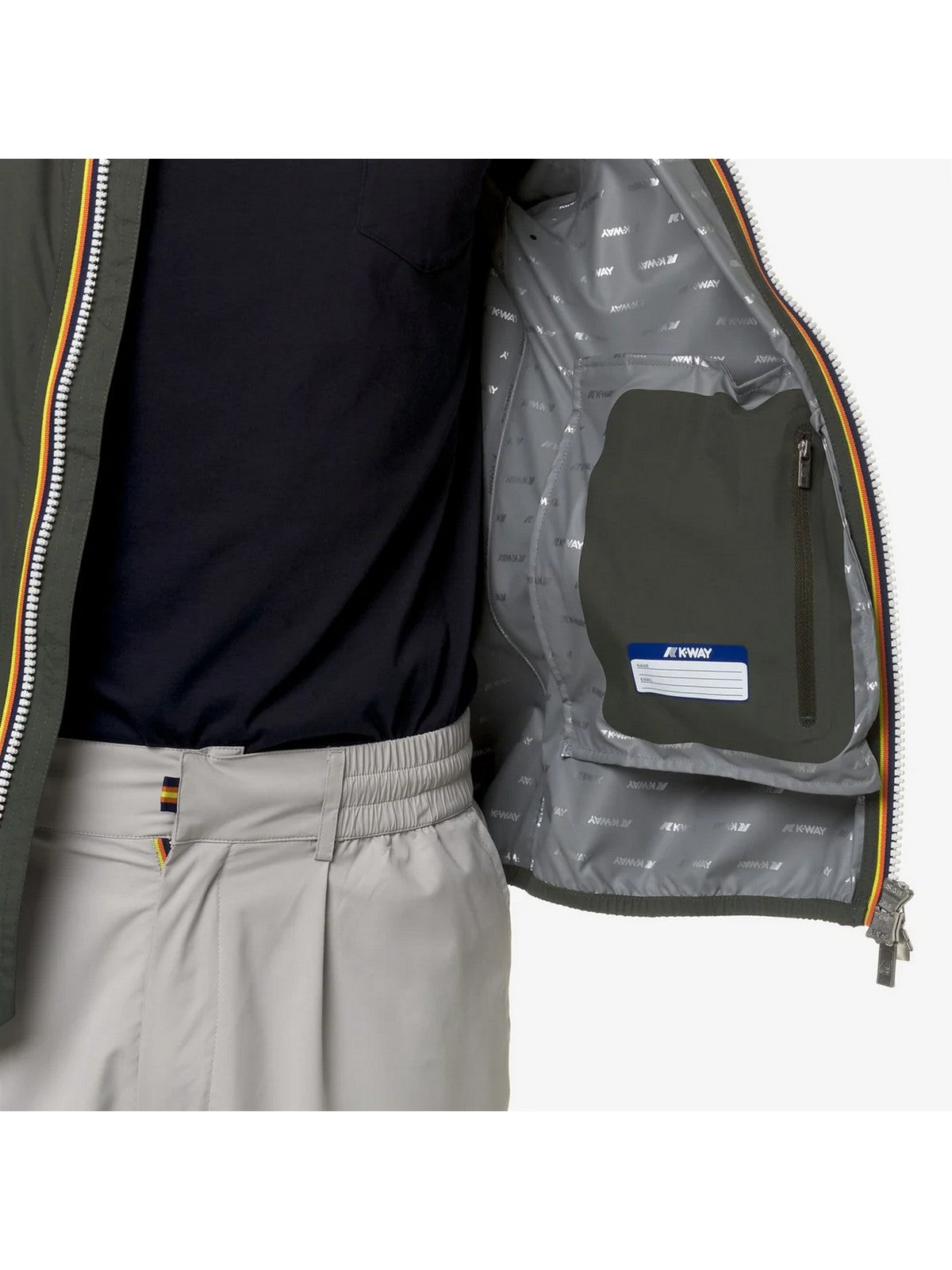 Giubbino K-WAY Jack da uomo ideale per le mezze stagioni e con vestibilità slim, realizzata in tessuto tecnico elasticizzato. L'interno è foderato con una membrana isolante decorata con lettering K-Way stampato all over in tonalità argento.