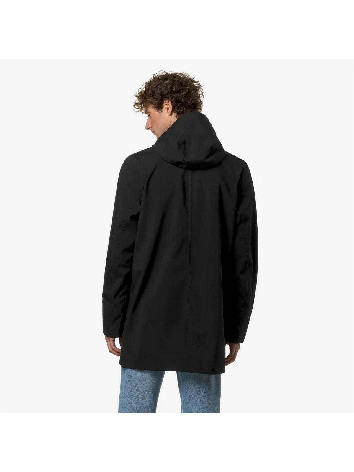 Parka K-WAY realizzato in tessuto tecnico accoppiato a 3 strati: lo strato più esterno in nylon, la membrana interna in materiale isolante e la fodera in jersey. Grado di calore leggero. Cappuccio non staccabile regolabile con corda elastica.