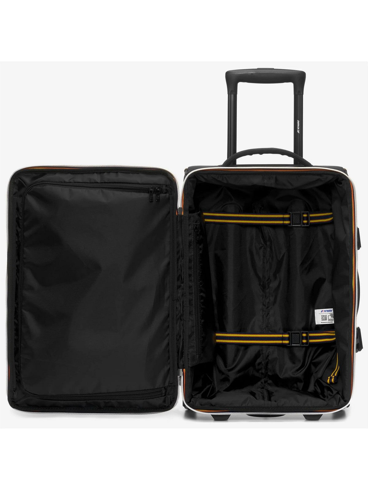 Trolley "Blossac S" K-WAY da viaggio realizzato in nylon ripstop impermeabile, idrorepellente, antivento. Tessuto di rinforzo applicato alla base per una maggiore resistenza. Ha dimensioni perfette per essere trasportato in cabina. L'accessorio presenta quattro ruote che seguono ogni movimento, tasche funzionali per organizzare il contenuto, manico superiore e laterale per la massima versatilità e manico rigido estraibile da tasca posteriore. Chiusura con zip a doppio cursore. Apertura principale con K-Way zip. Regolazione laterale di contenimento. Bustina di riconoscimento agganciabile. Scompartimenti multifunzionali interni. Logo bianco in silicone.